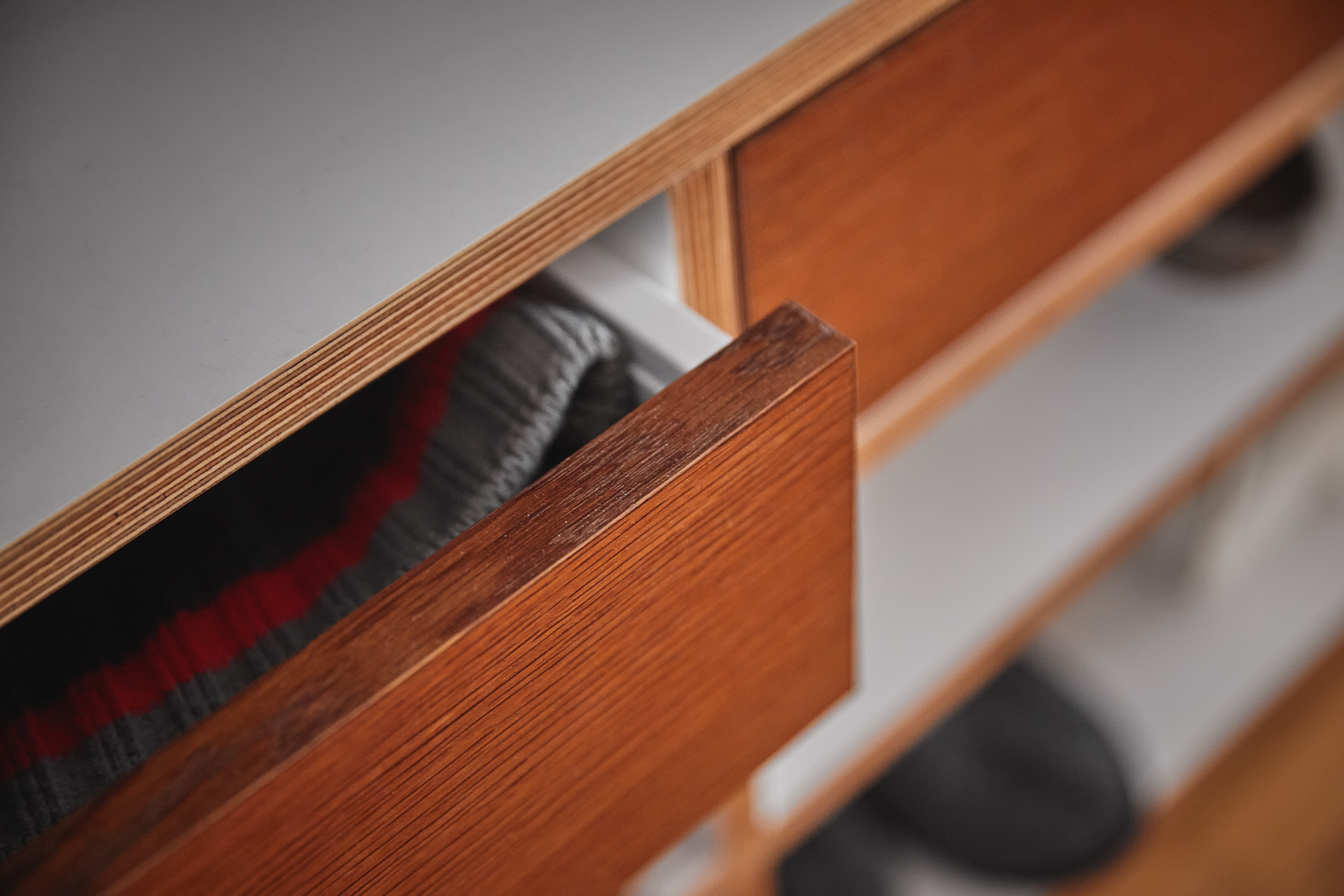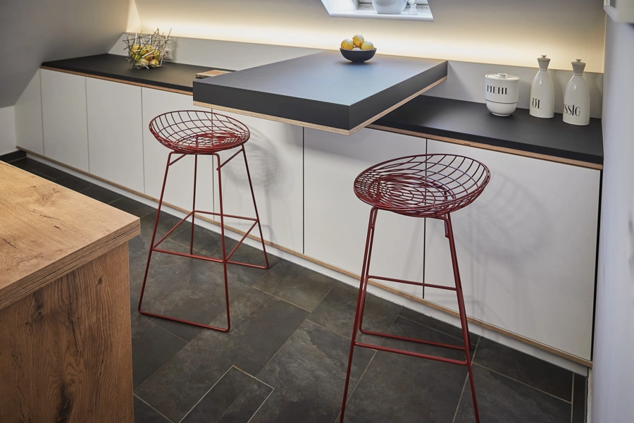 - ein Dachschrägenschrank schafft zusätzlichen Stauraum, im Bereich des Dachschrägenfensters ist ein Stehtisch aufgesetzt