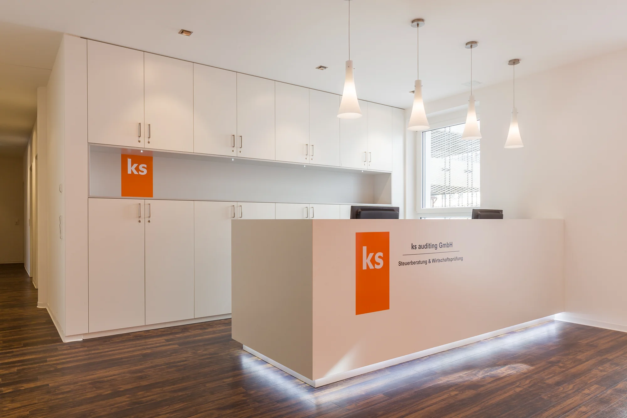- Eingangsbereich: Tresen auf Gehrung gefaltet, indirekte Beleuchtung im Sockelbereich, Rückschrank durch offenes Fach raumhoch geteilt und mit Akzentbeleuchtung, Schränke ausgestattet mit Schließsystem