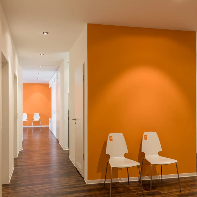 - Einladender Empfangsbereich durch stimmiges Beleuchtungskonzept und klare Linienführung