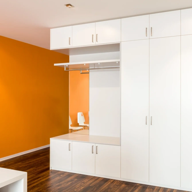 - Stauraumschränke raumhoch, mit integrierter Garderobe und Spiegel, Hutboden und Kleiderstange einseitig freitragend mit Akzentbeleuchtung