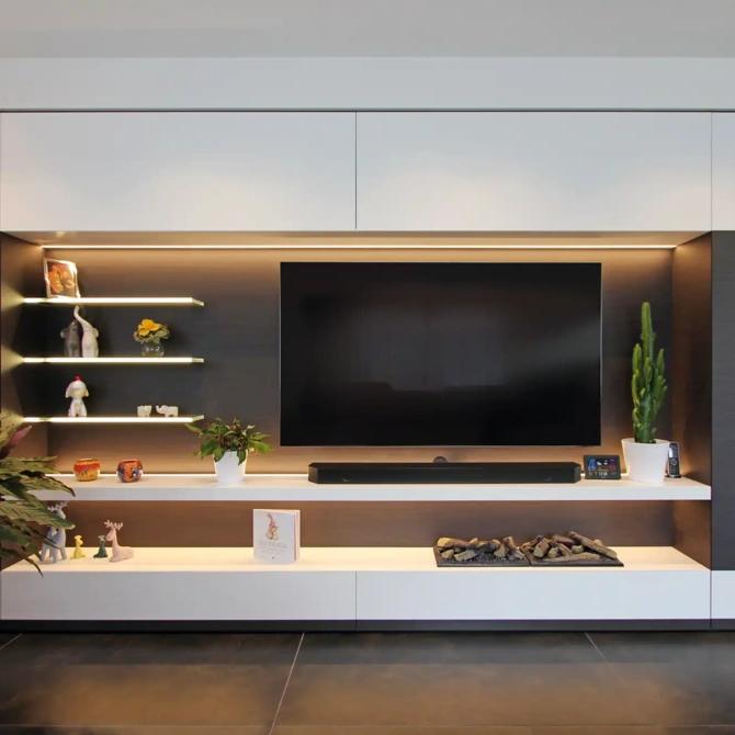 - Wohnwand mit TV-Nische, Stauraum, Glasböden und Dekofeuer