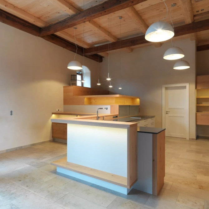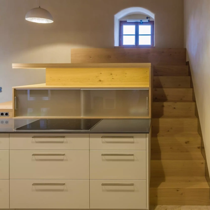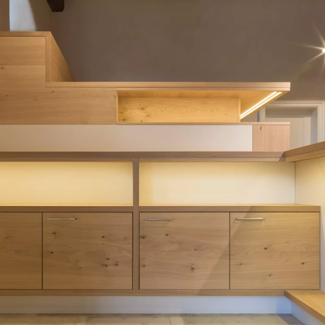 - Podest, Treppe und Fronten aus Wildeiche Starkfurnier, geölt