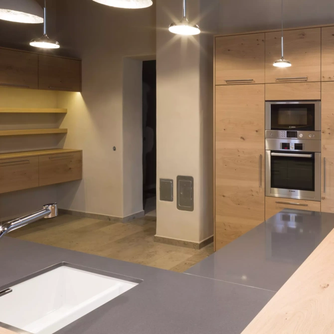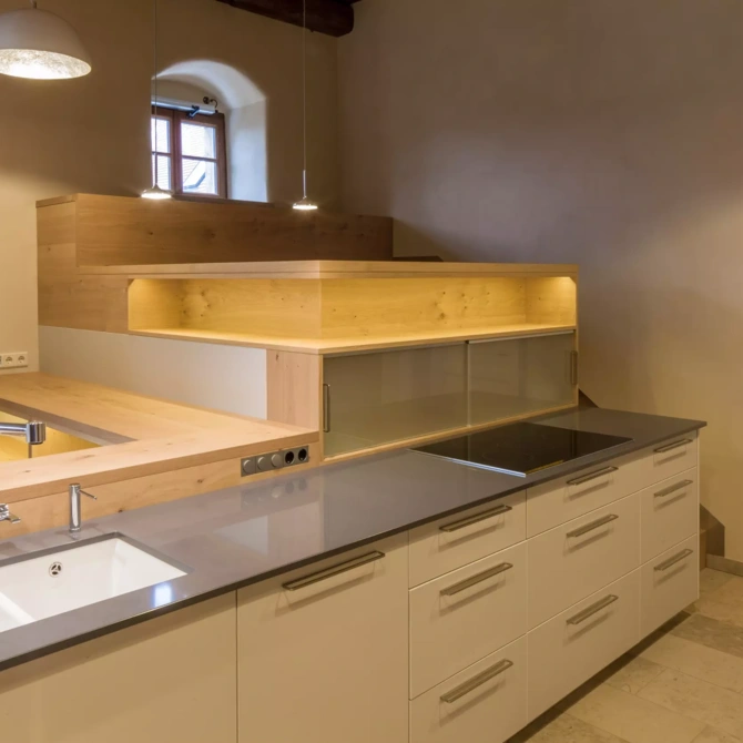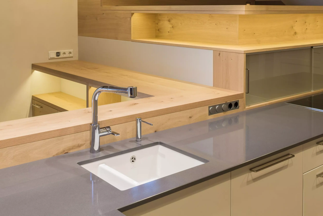 - Arbeitsplatte aus Quarzstein, pflegeleicht und langlebig