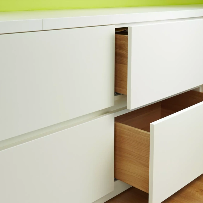 - Funktionales Stauraumkonzept mit durchdachten Regalen und Schubkästen