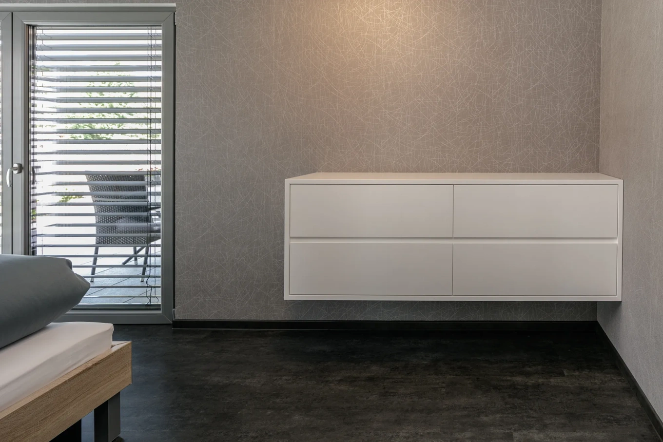 - Ankleidezimmer mit raumhohen Schränken und mit Softclose-Funktion, individuell nach Kundenwunsch an den Raum angepasst