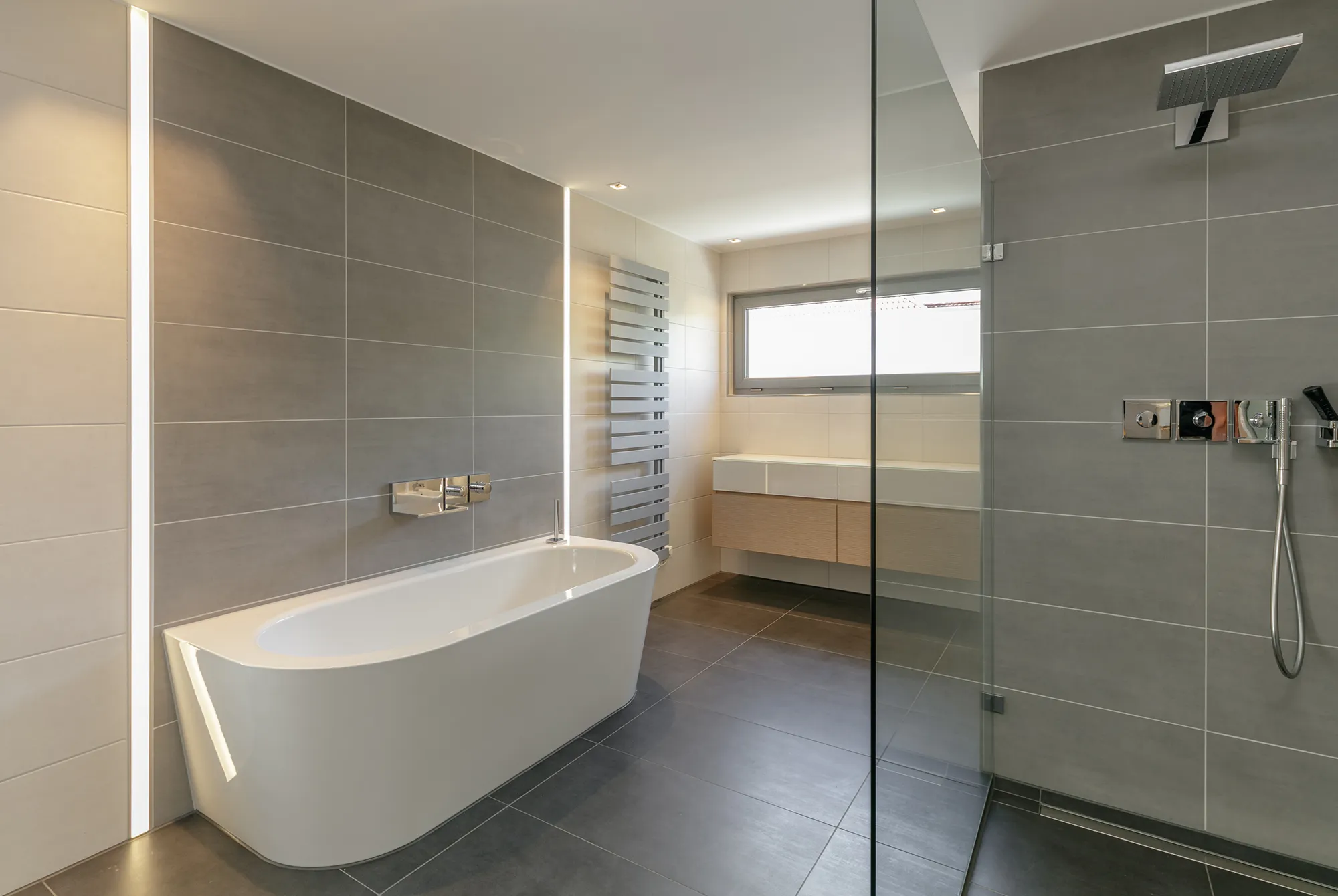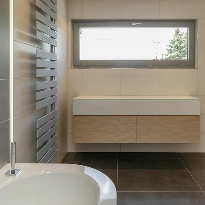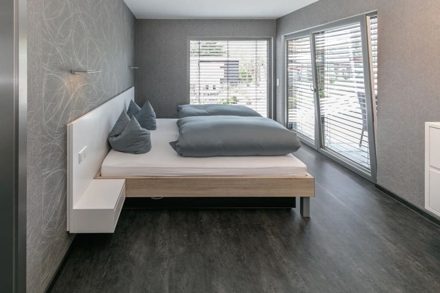 - Harmonisches, kantiges Design zur klaren nüchternen Linie des Wohnhauses