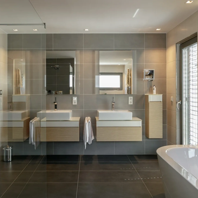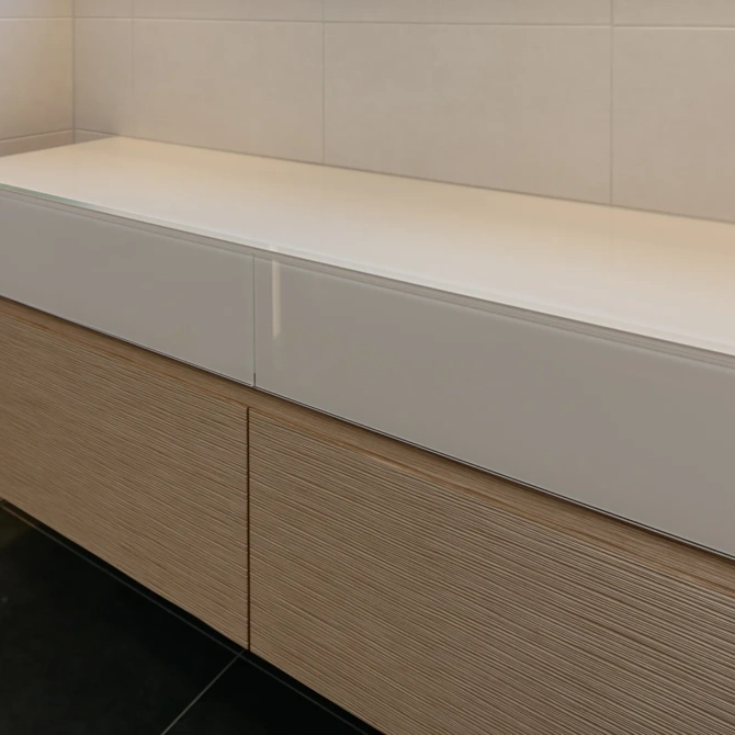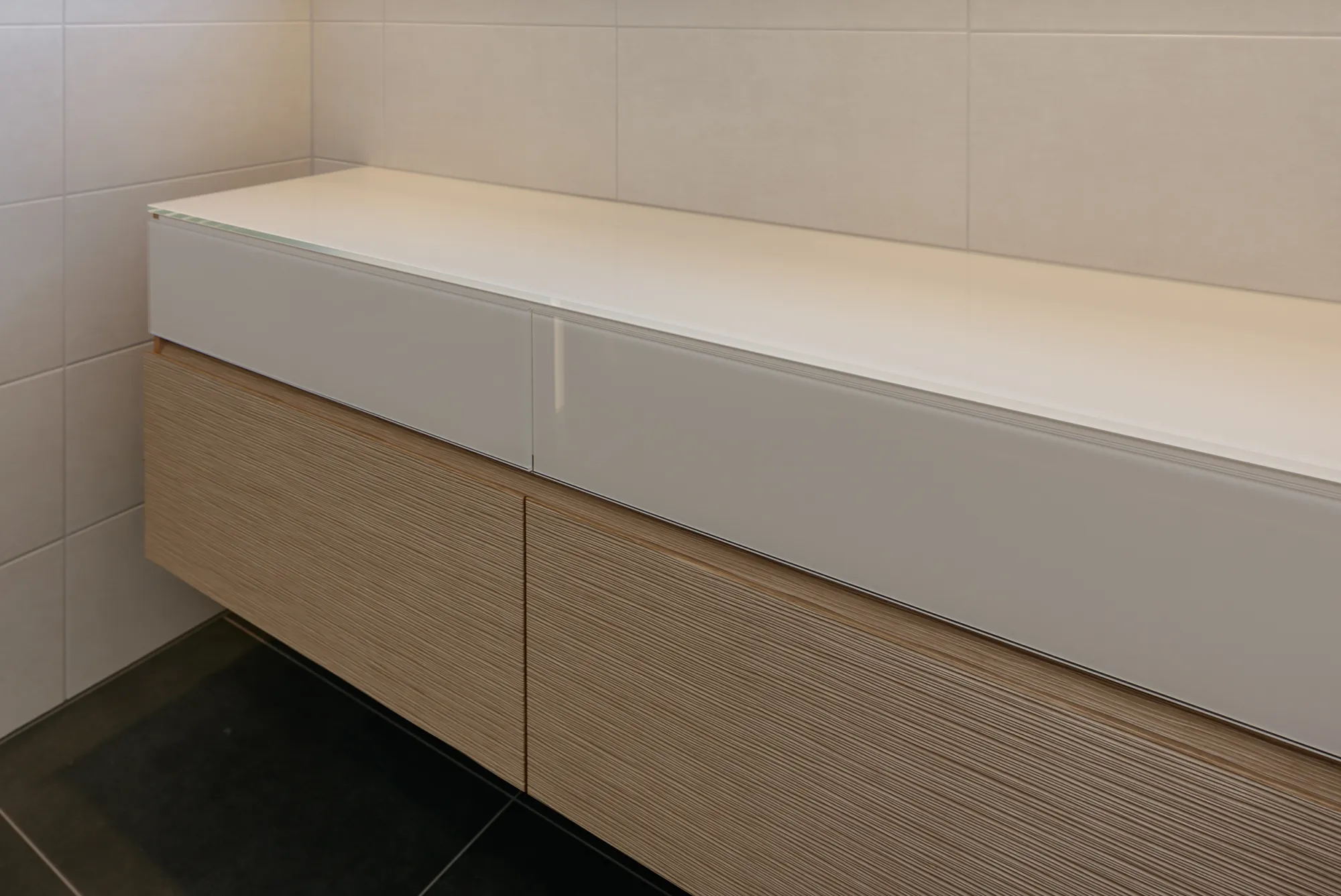 - Design der Badezimmermöbel angepasst an Serienmöbel von Villeroy & Boch, Oberteil mit aneinanderstoßenden Glasplatten und eingefräster Griffmulde in den Türen