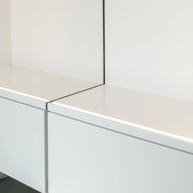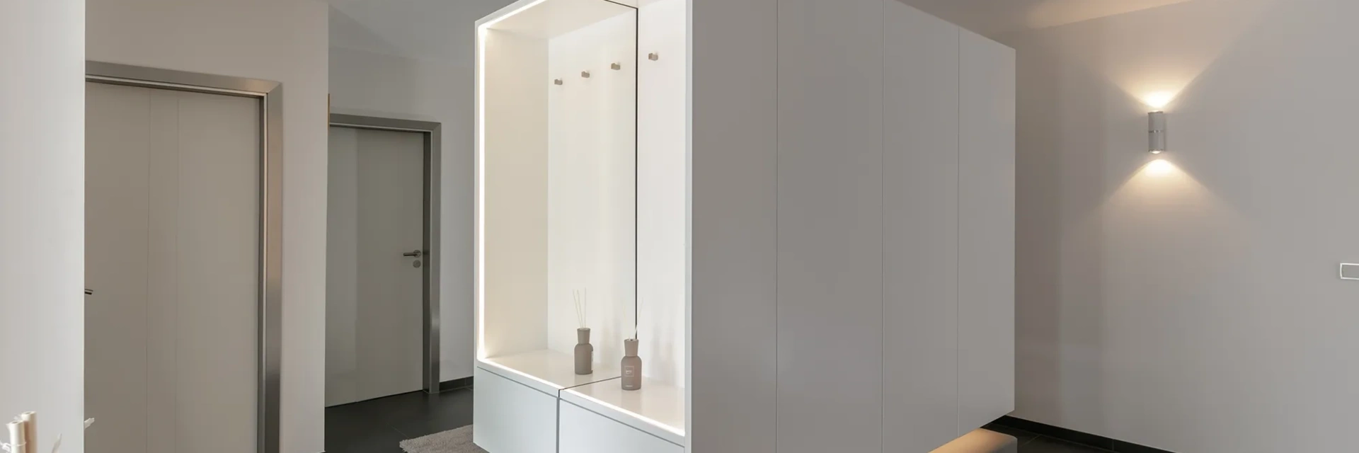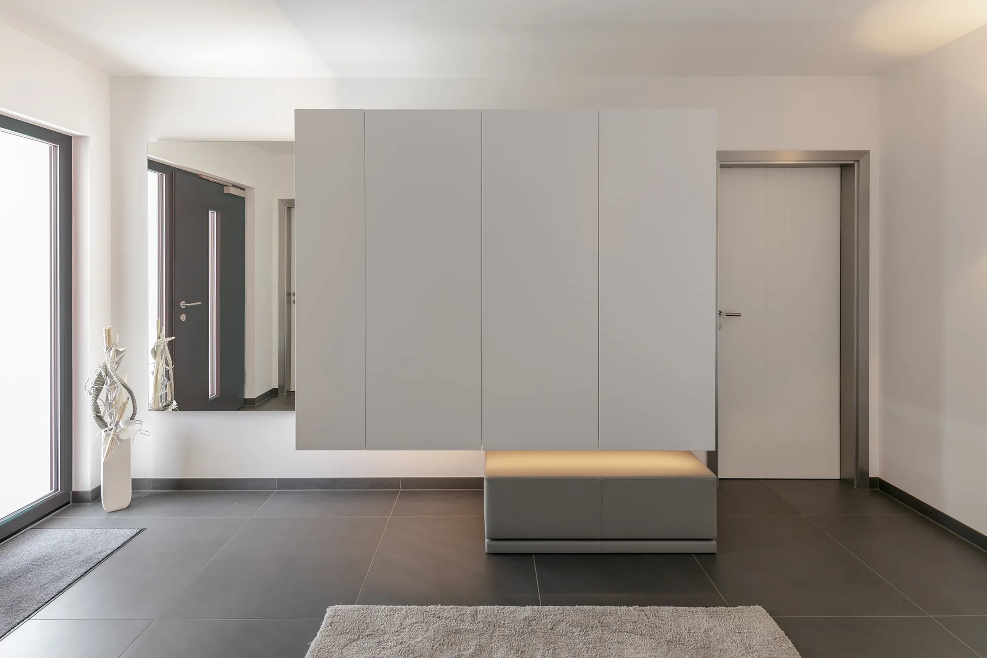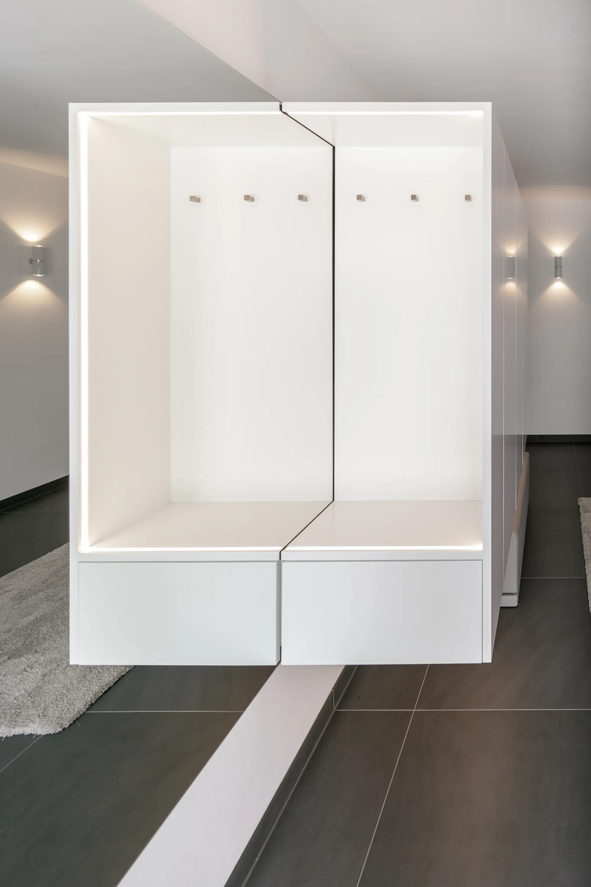 - Ankleidezimmer mit raumhohen Schränken mit mobiler Sitzbank und integrierter Beleuchtung