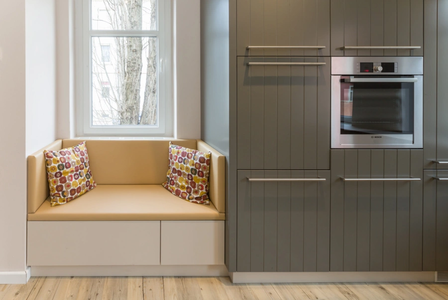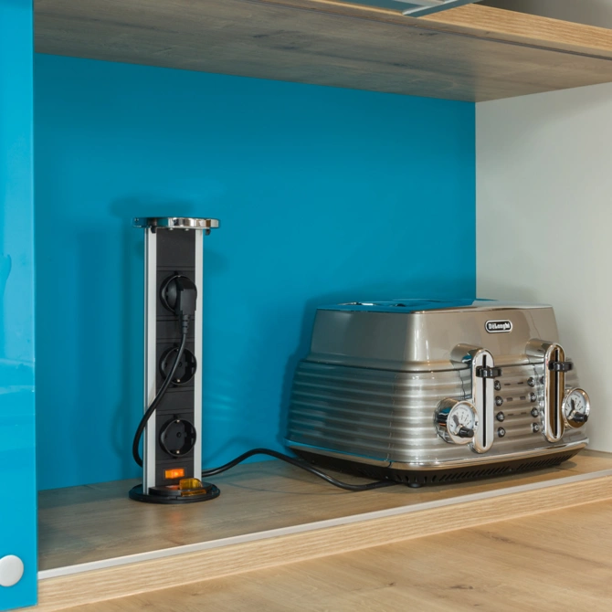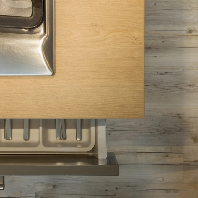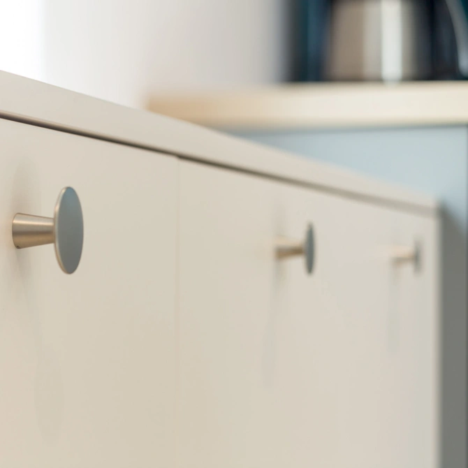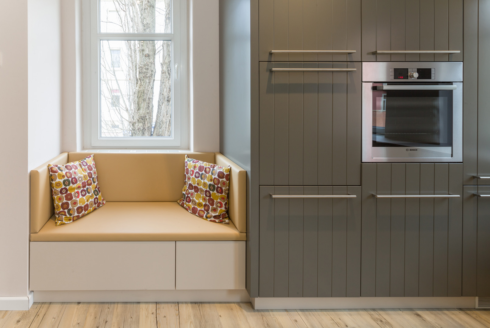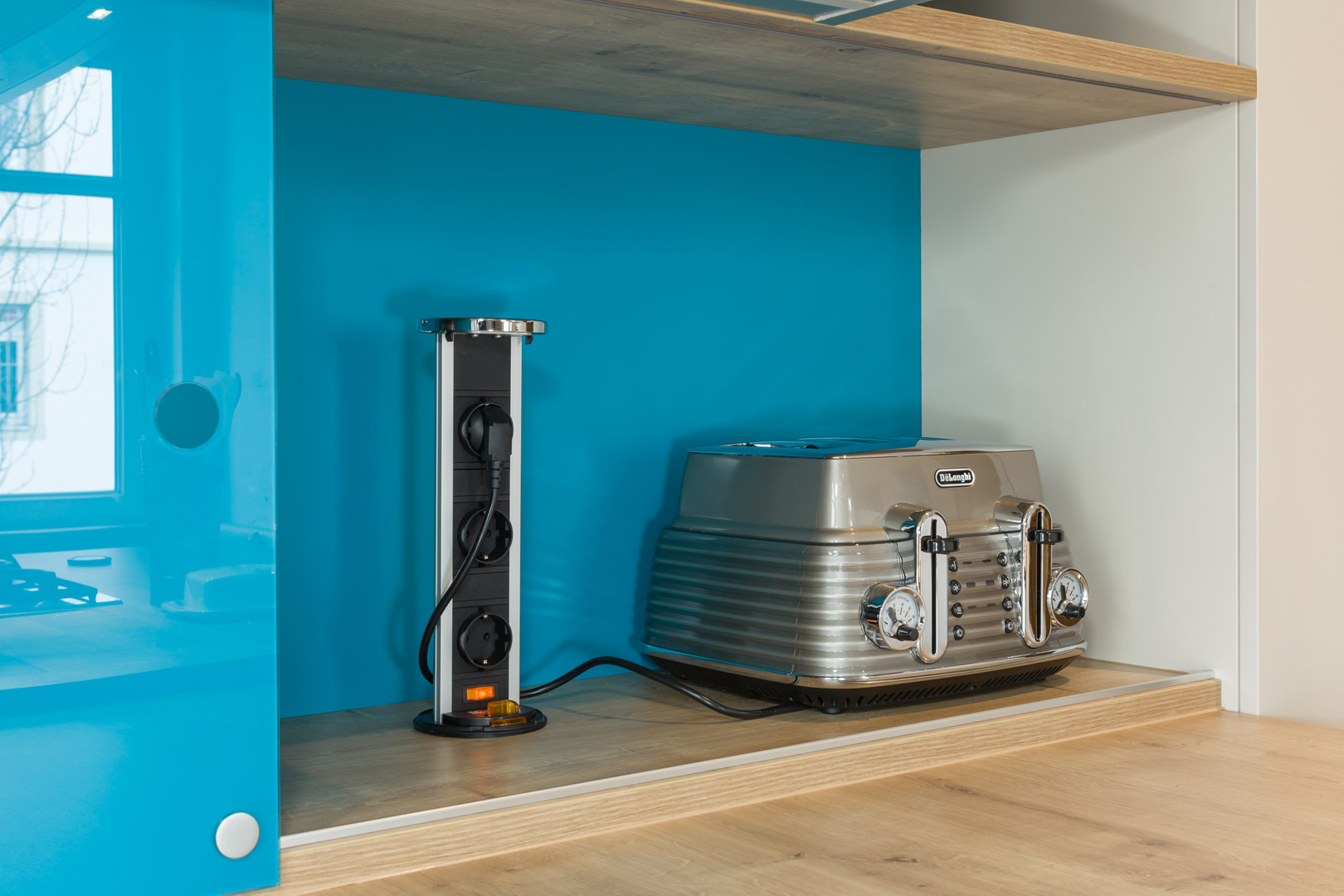 - Farbige Glasschiebetür zum Verdecken der sonst üblicherweise sichtbaren Küchengeräte (Toaster, Kaffeemaschine, etc.)
