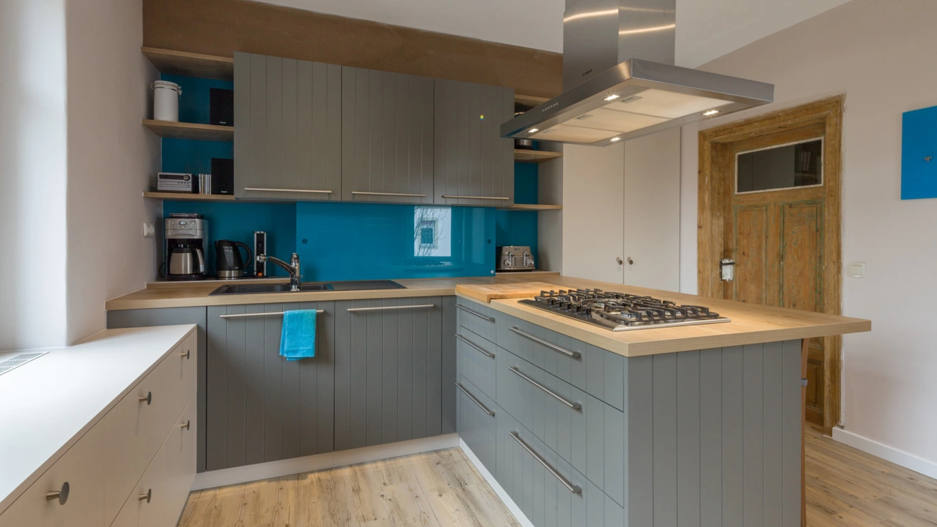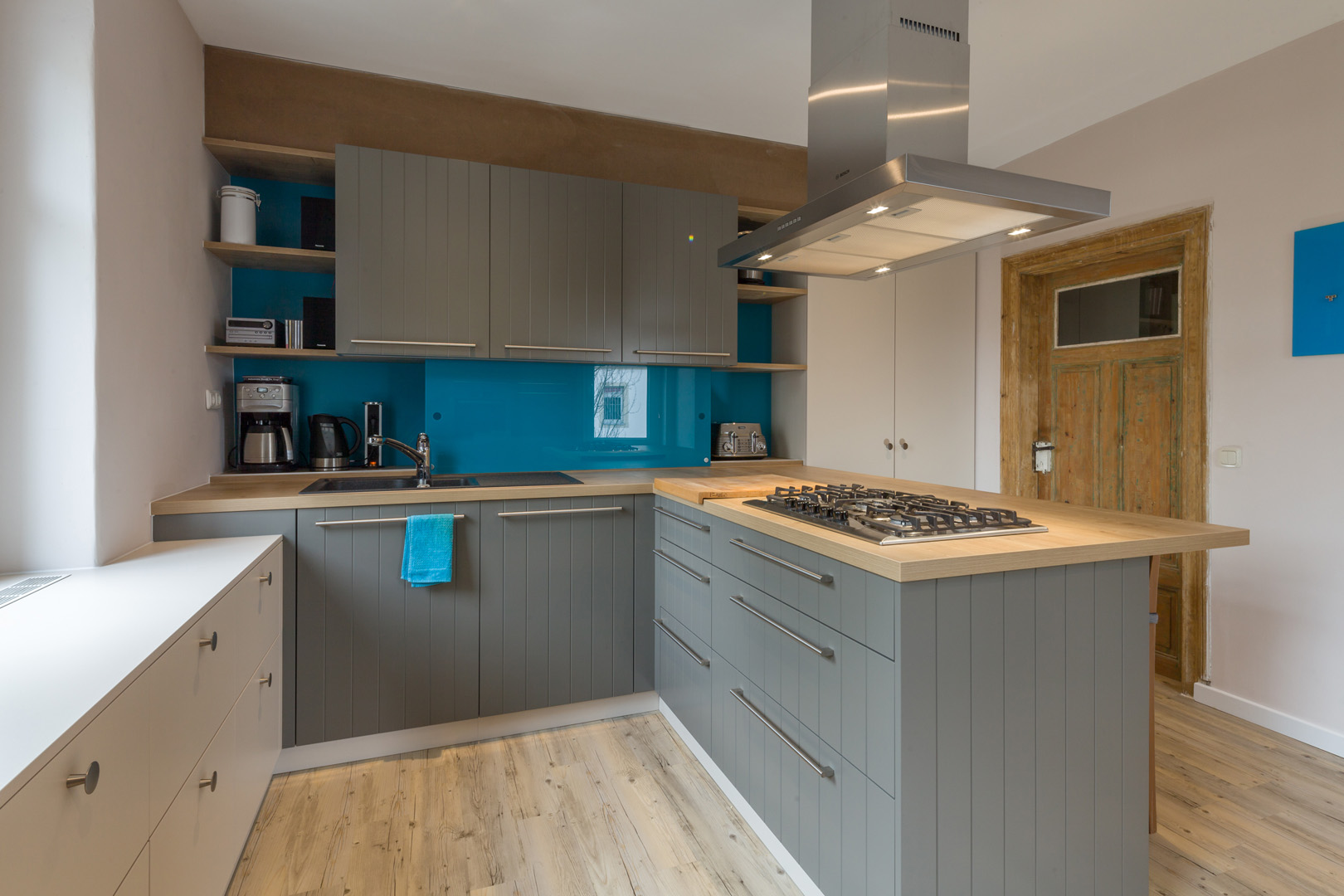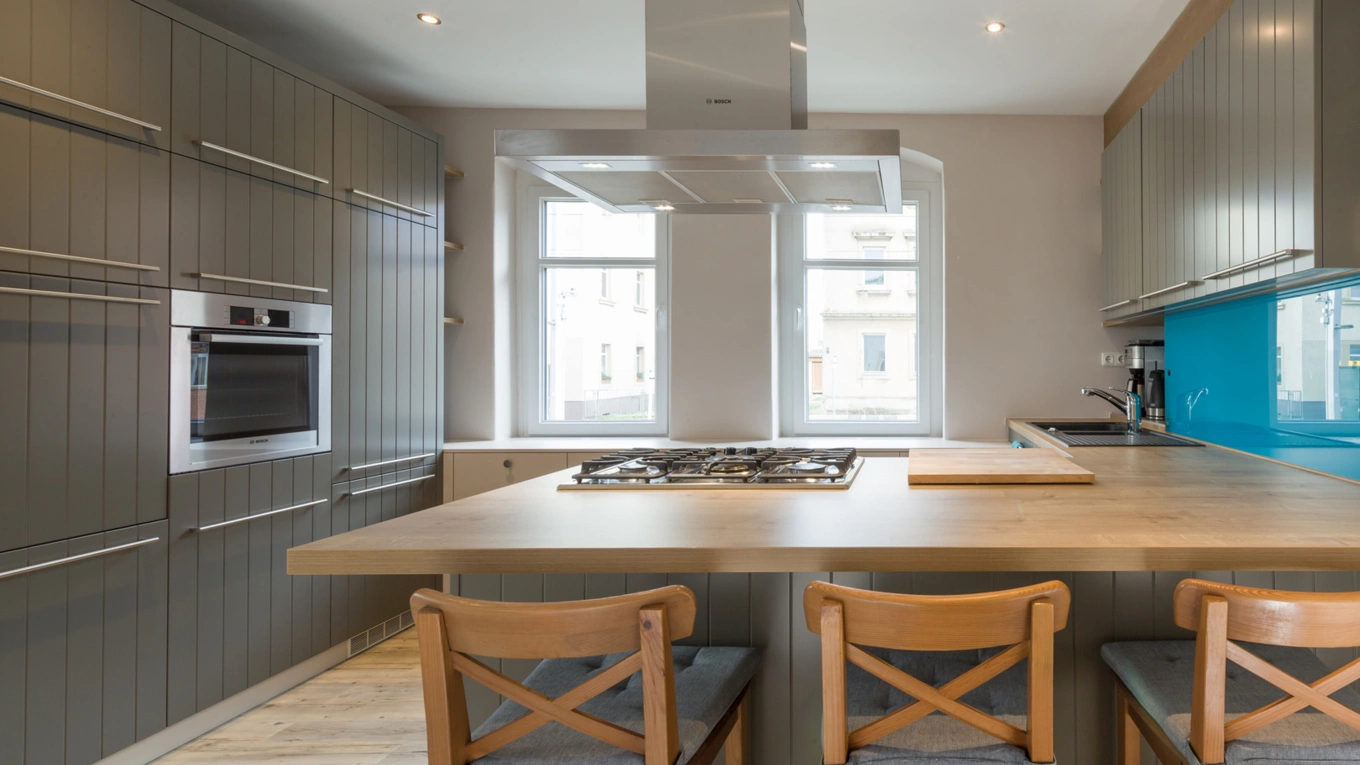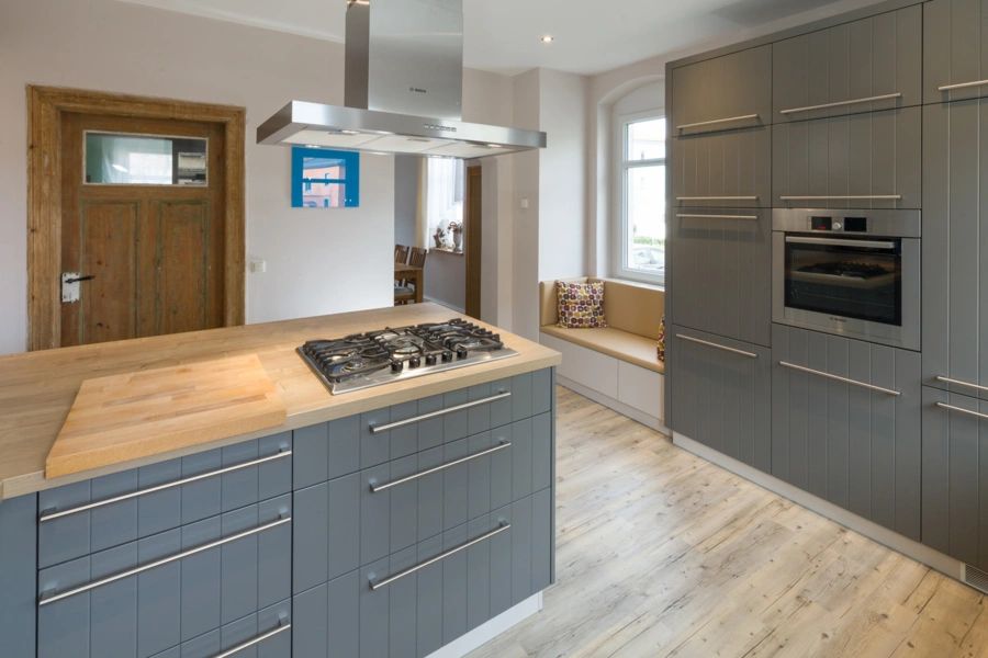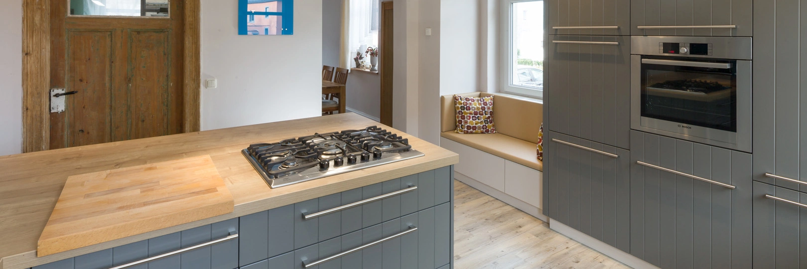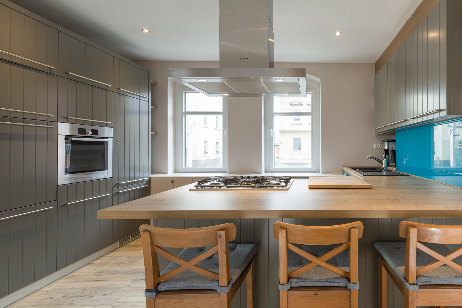- An drei Wänden umlaufende Küchenkonstruktion mit dem Wunsch nach viel Stauraum und Funktionalität