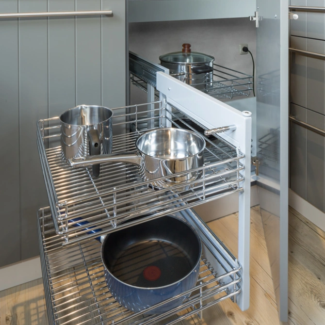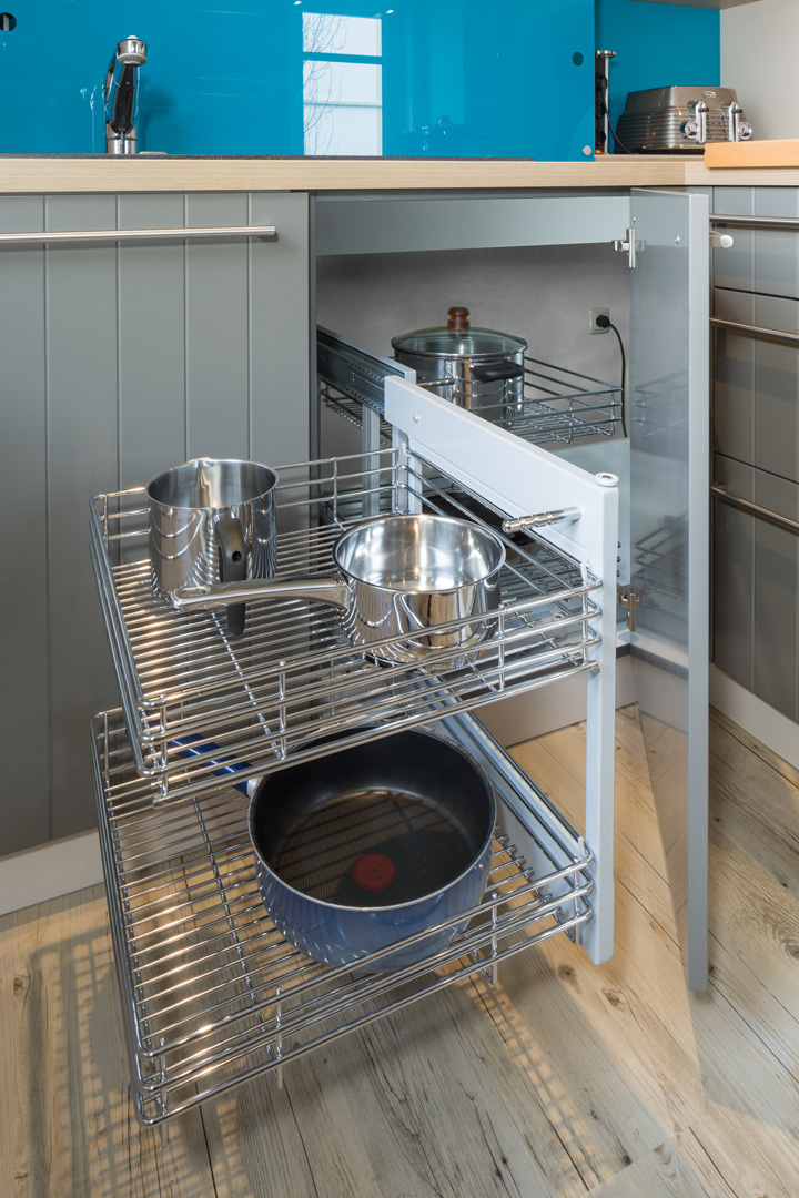 - Sideboardstrecke mit Schubkästen, Kücheninsel mit Eckauszug und Schubkästen