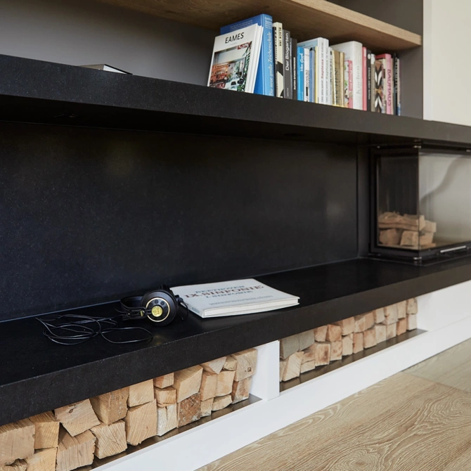 - Naurstein Nero Assoluto für die Arbeitsfläche und Möbelakzente im Wohnzimmer