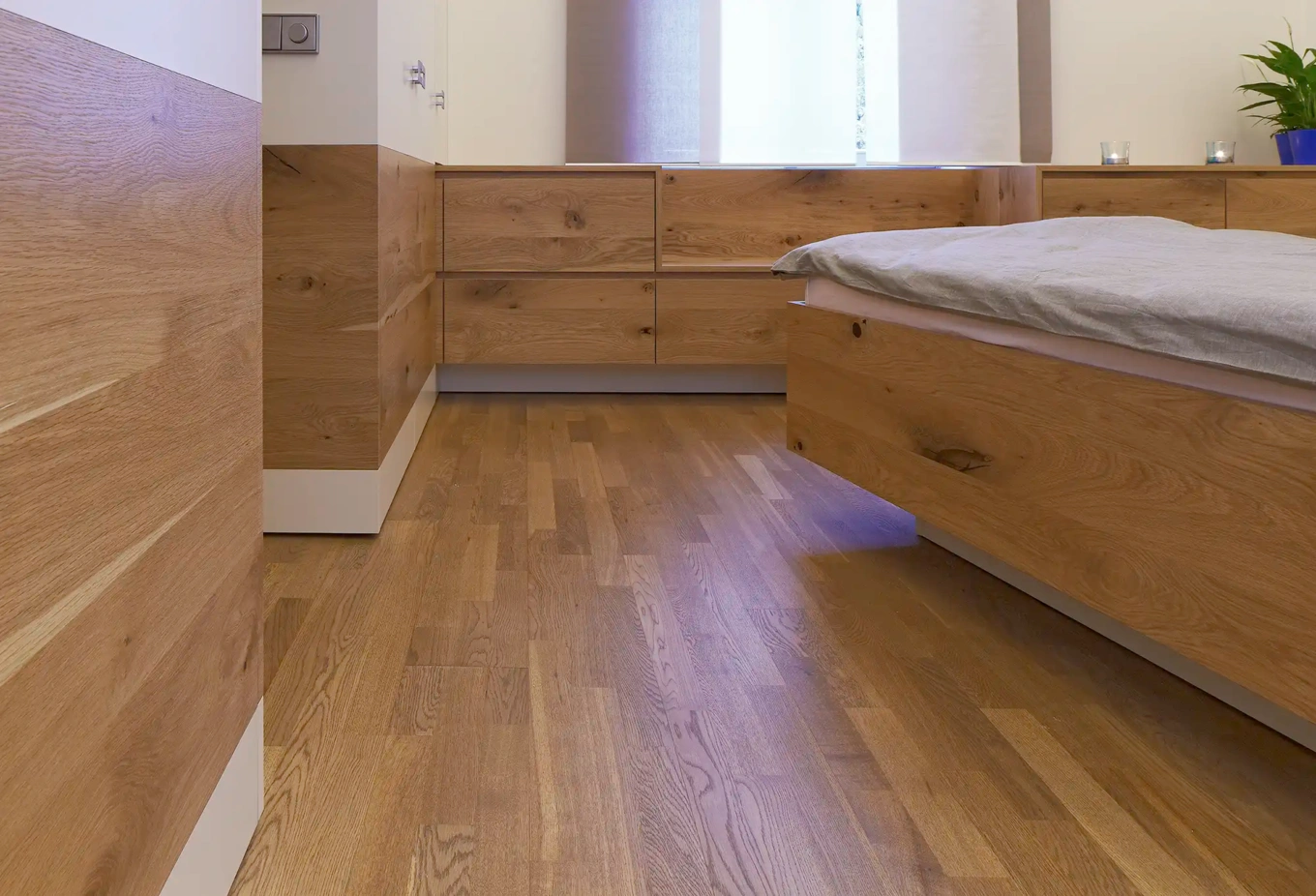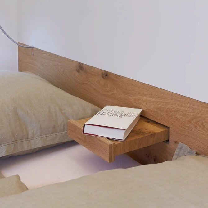 - Bett wirkt schwebend mit integrierten Leseleuchten und Tablarauszug im Betthaupt