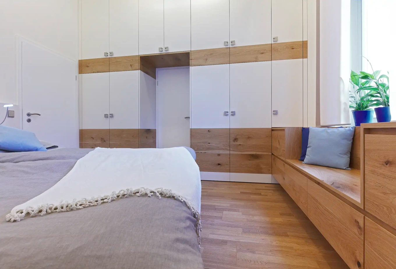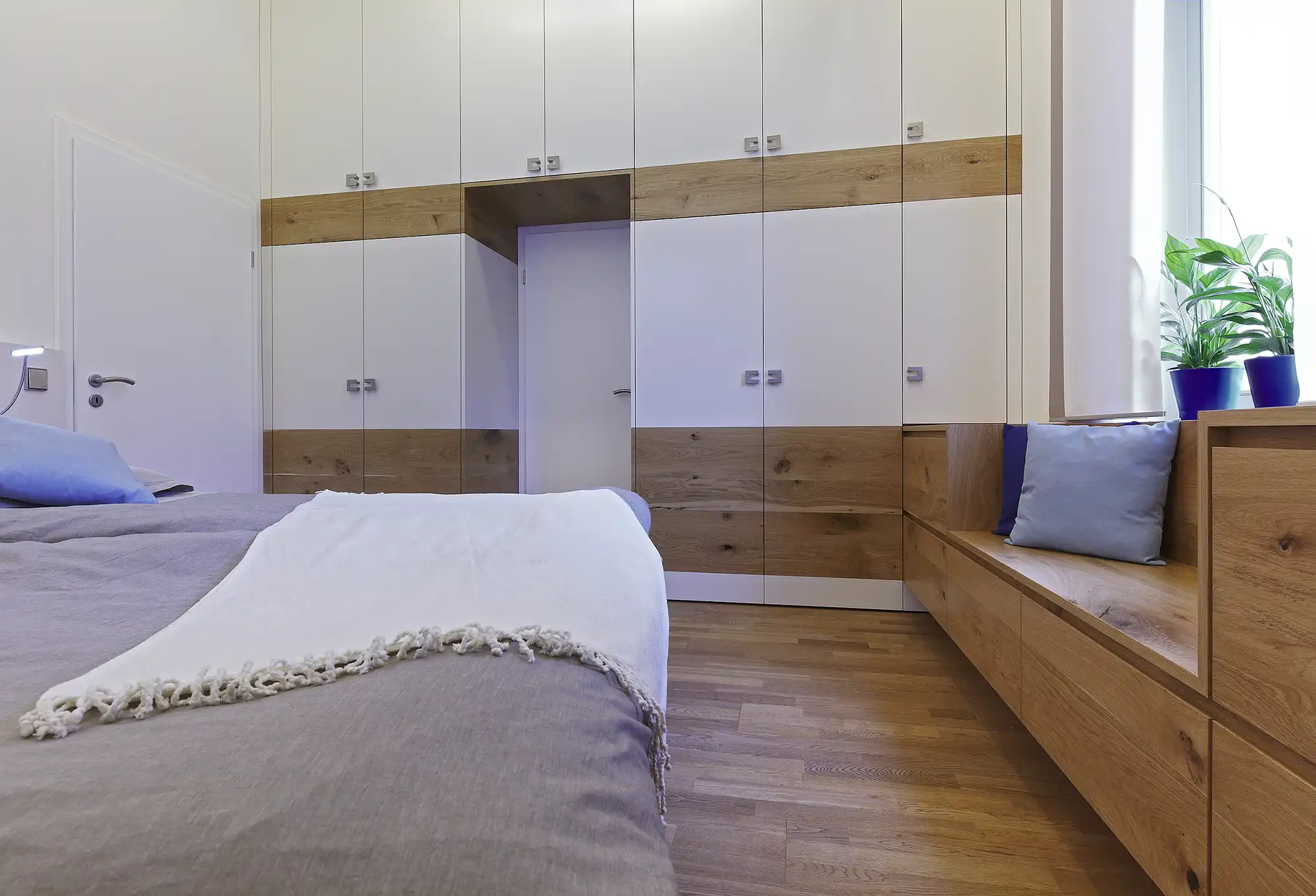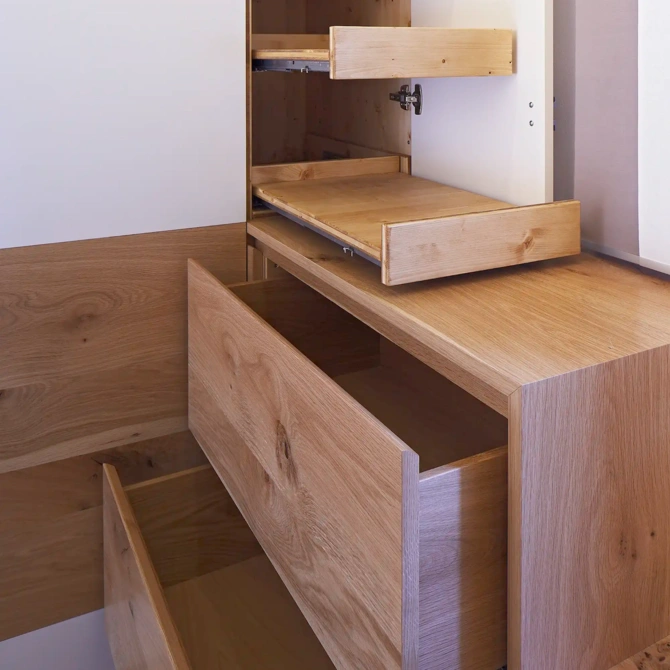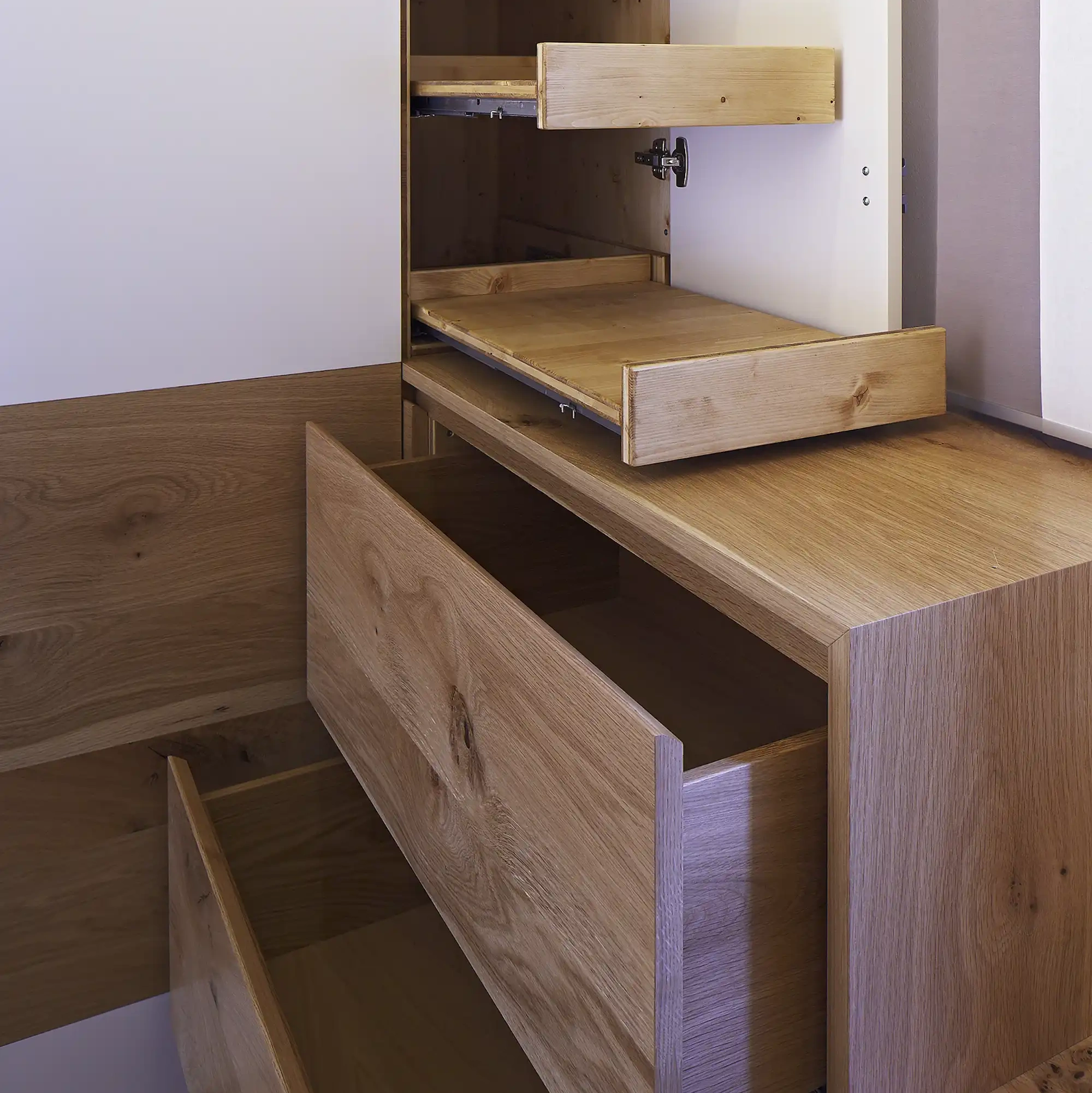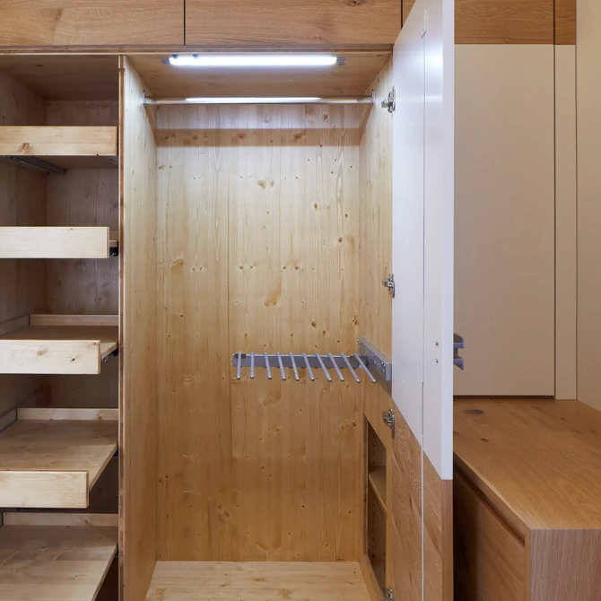 - Stauraumnutzung durch ausziehbare Einlegeböden und Kleiderlifte