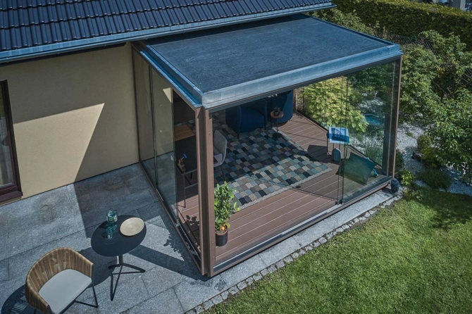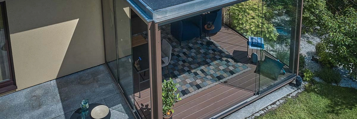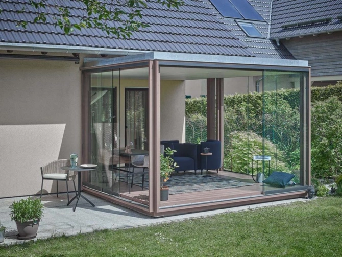Der PAVEL wird zum angeschlossenen Raum, der dennoch die räumlichen Grenzen zu sprengen scheint. Die Natur im eigenen Garten wird zum Protagonisten im Wechselspiel von Licht, Holz und Glas. Die rundum eingesetzten, raumhohen Panoramafenster schaffen einen nahezu barrierefreien Austritt zu Garten und Terrasse und in Kombination mit den natürlichen Materialien entsteht ein fließender Übergang zwischen drinnen und draußen. Die Besonderheit bei diesem Projekt ist die direkte Verbindung mit der bestehenden Gebäudehülle.