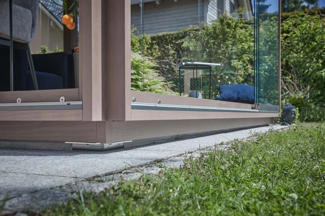 Bei der Planung und Dimensionierung des PAVEL haben wir darauf geachtet, dass der Anbau nicht baugenehmigungspflichtig wird, das konnten wir durch die angepassten Abmessungen erreichen. Für die fundamentfreie Aufstellung haben wir einen neuen Stützenfuß entwickelt, durch den wir die Konstruktion auf der bestehenden Terrasse aufsetzen und die Höhe stufenlos einstellen können.