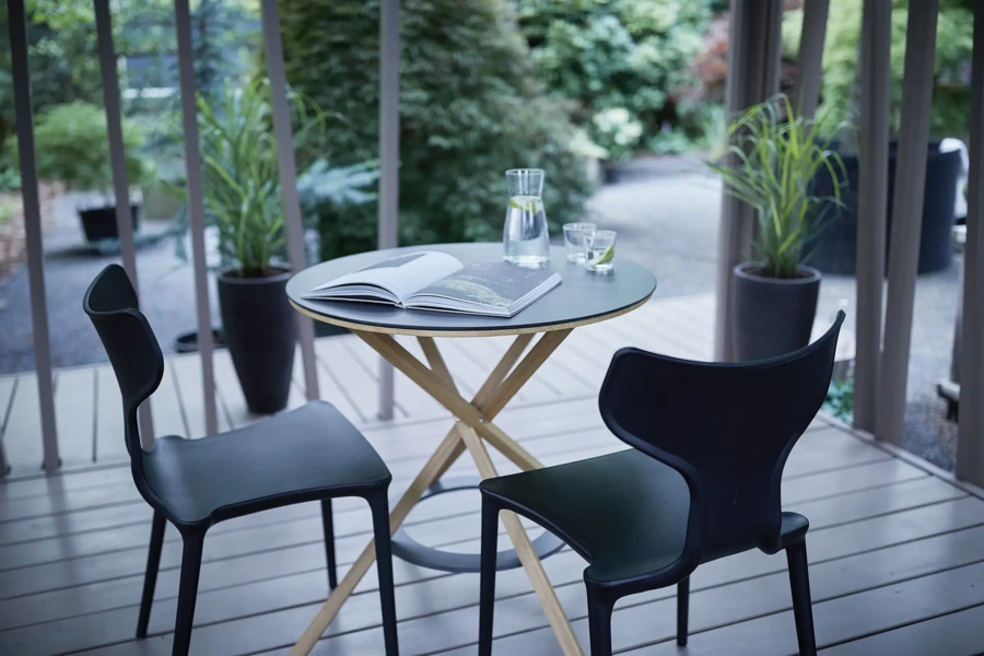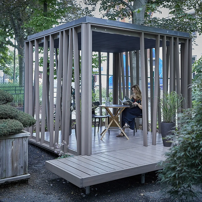 Dieser PAVEL dient als Besprechungsort und gleichzeitig als transparenter Ausstellungspavillon in einem Mustergarten. Die schräge Wandgestaltung ist dem Blätterwerk und der Baumstruktur eines Waldes nachempfunden und schafft ein natürliches Raumgefühl, ohne einzuengen. Seine zurückhaltende Farbkombination aus Sesam und Graublau wirkt warm, fast wie ein Nest.