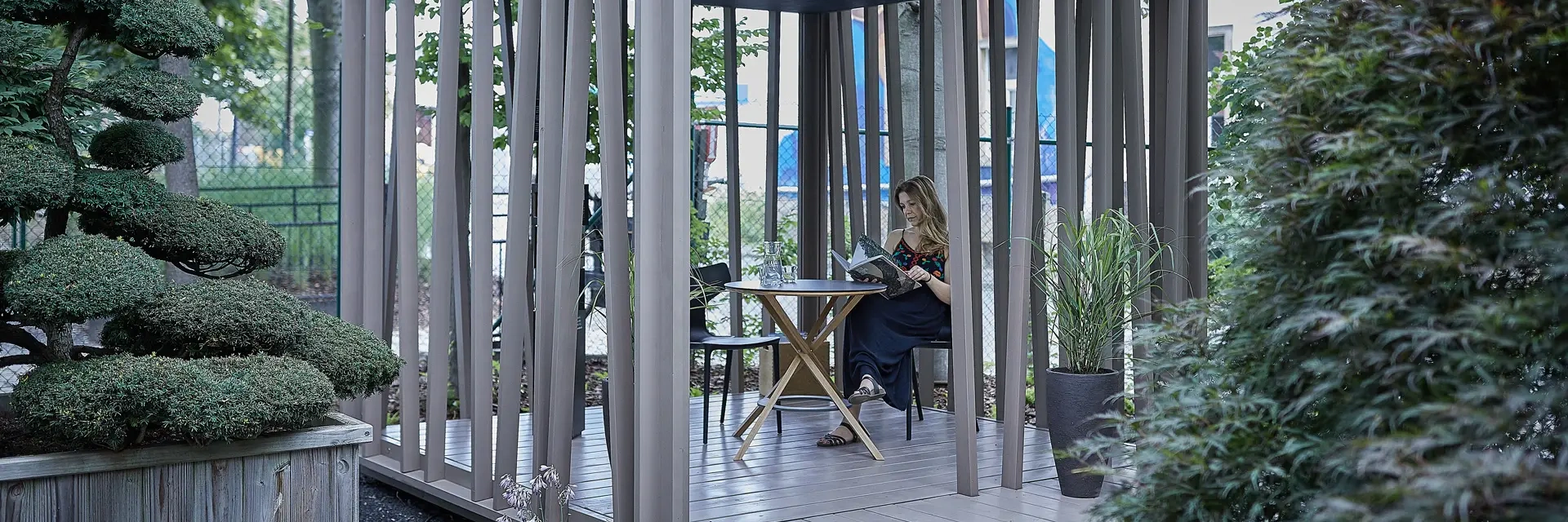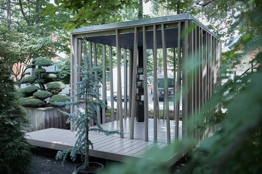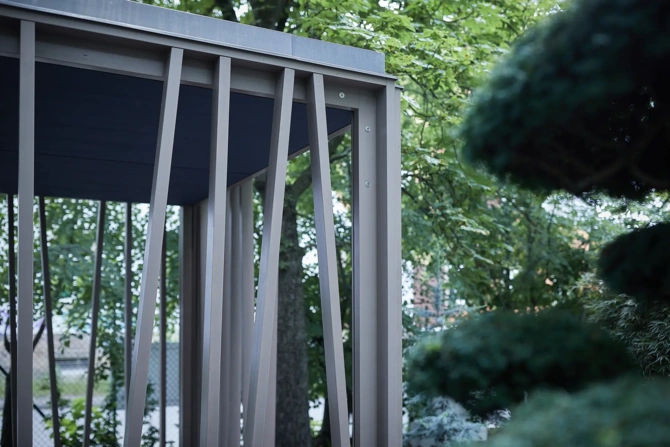 Beim Streifzug durch die Kollektion handverlesener Solitärpflanzen zeigt sich dieser Pavillon unaufgeregt, fast selbstverständlich zwischen der anmutigen Baumschulkunst. Ein unscheinbarer Solitär, der diesen Ort auf wunderbare Weise markiert, ohne ihn zu stören.