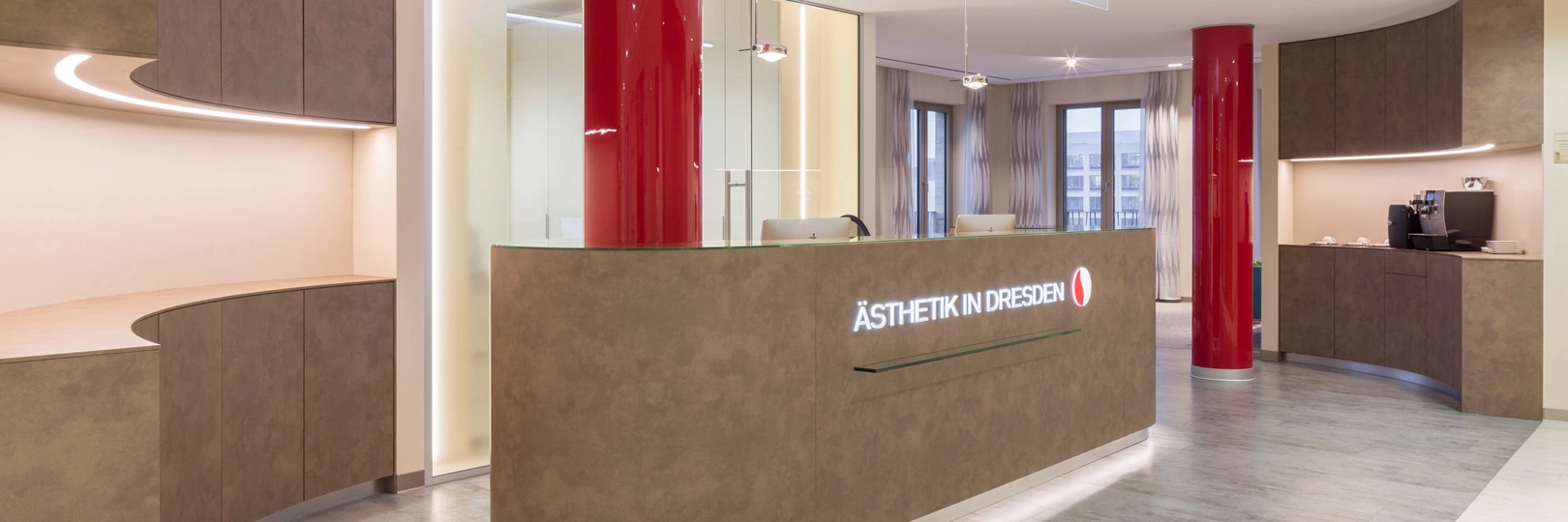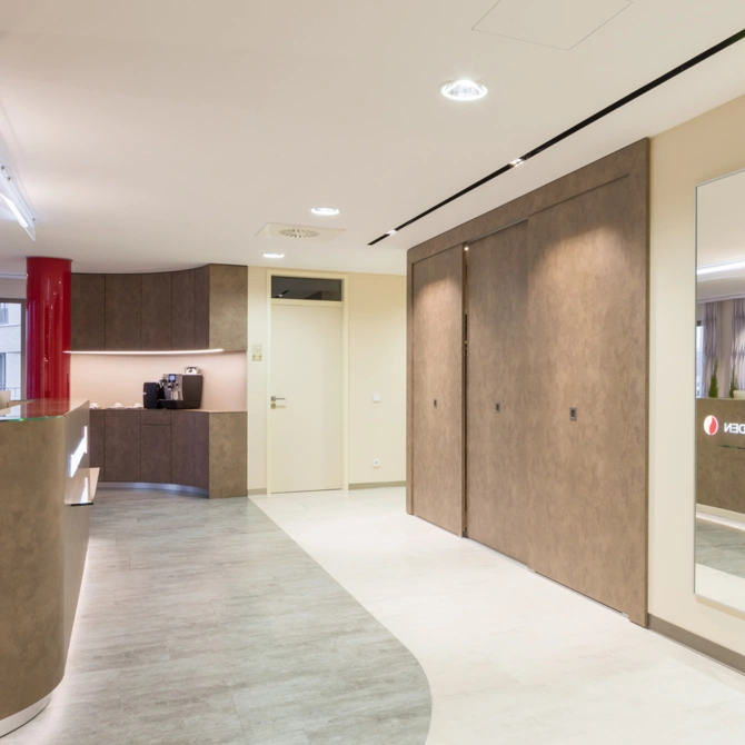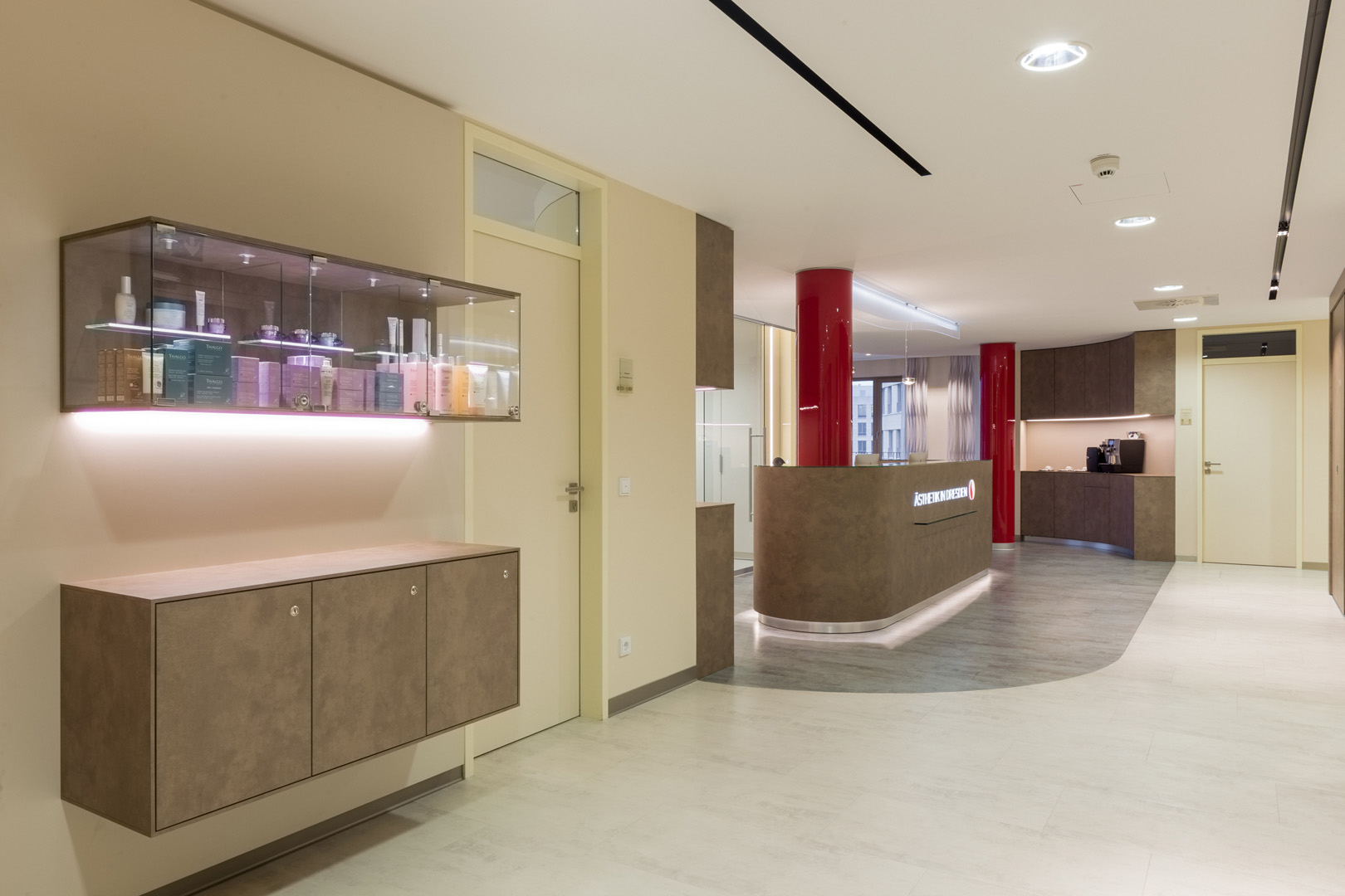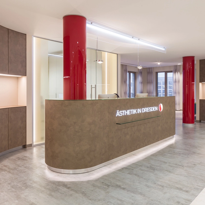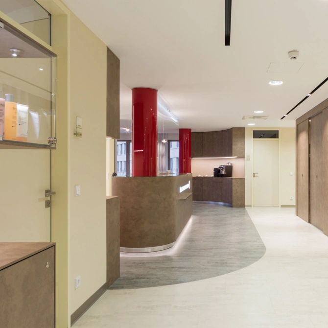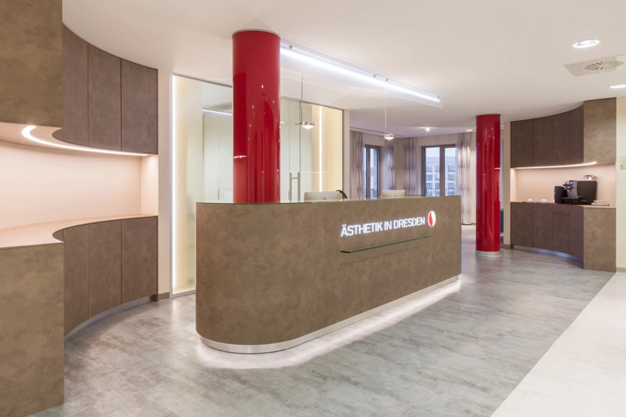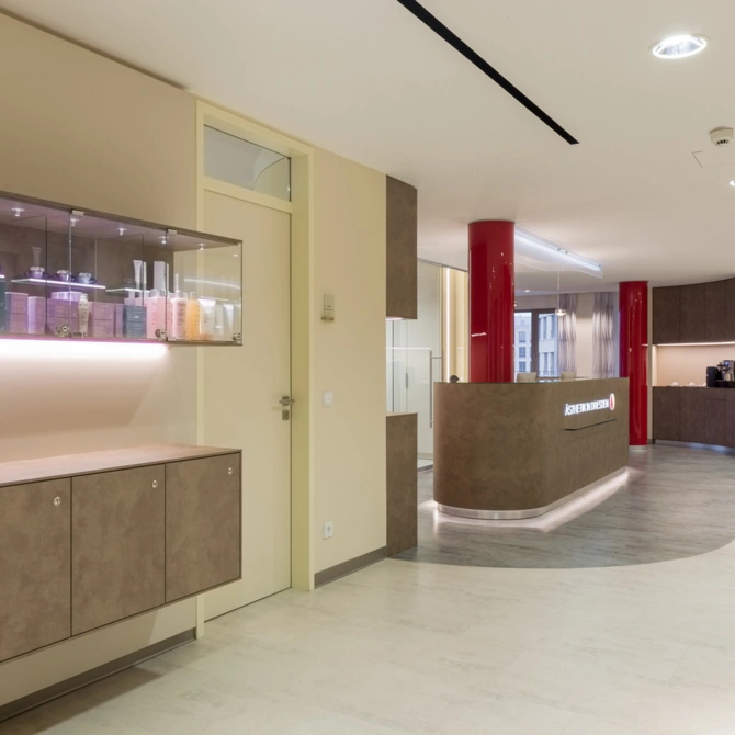 - Zentral gelegener Empfangstresen mit zwei Arbeitsplätzen inkl. Schubkästen