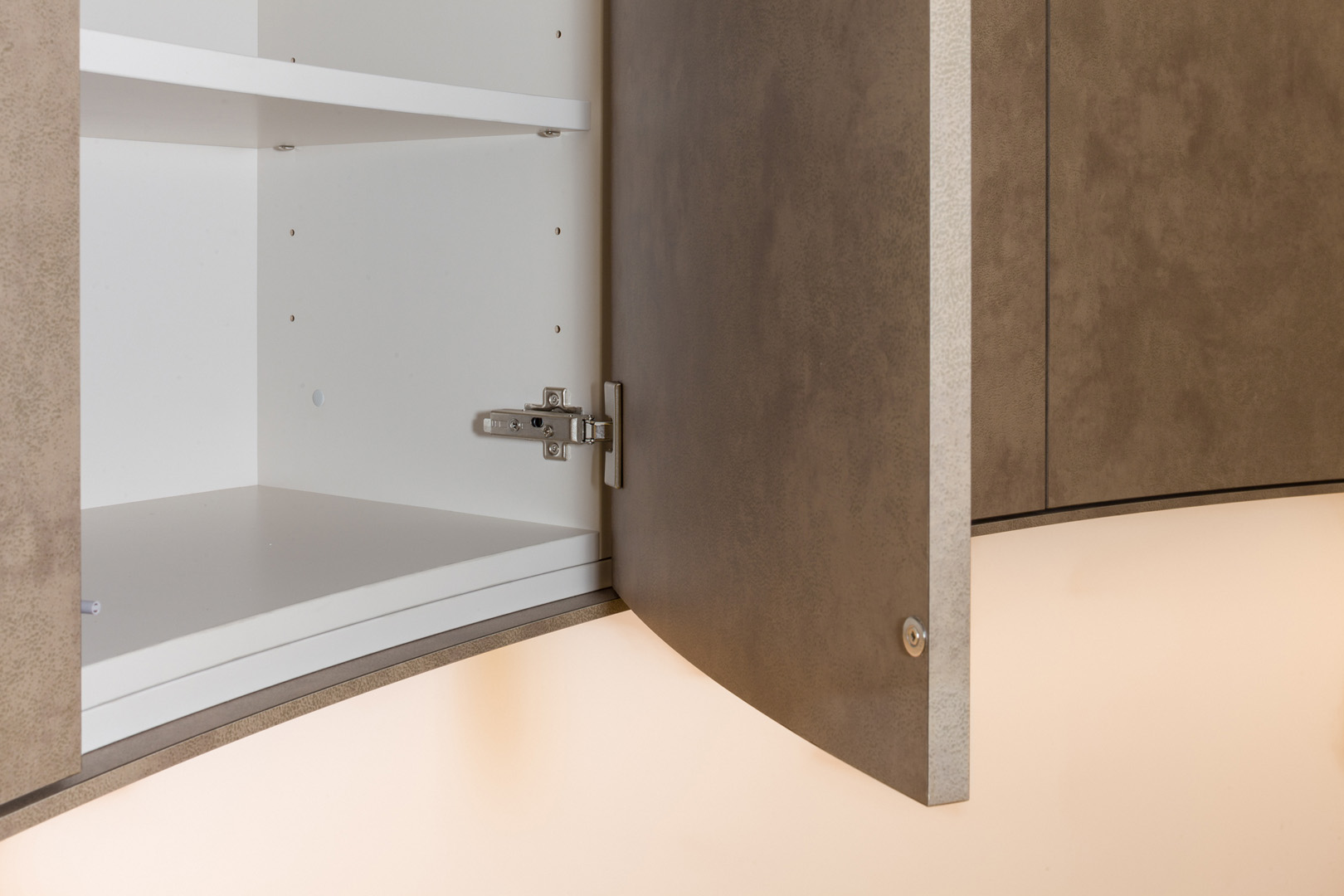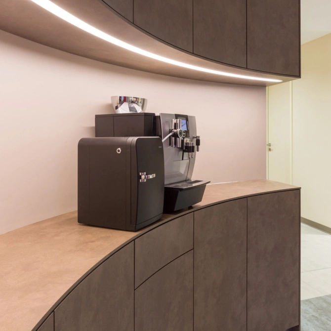 - Zwei raumhohe Rundschränke in Viertelkreisnischen (Unterschränke + Hängeschränke), rechter Schrank fungiert als Kaffeestation/Küche