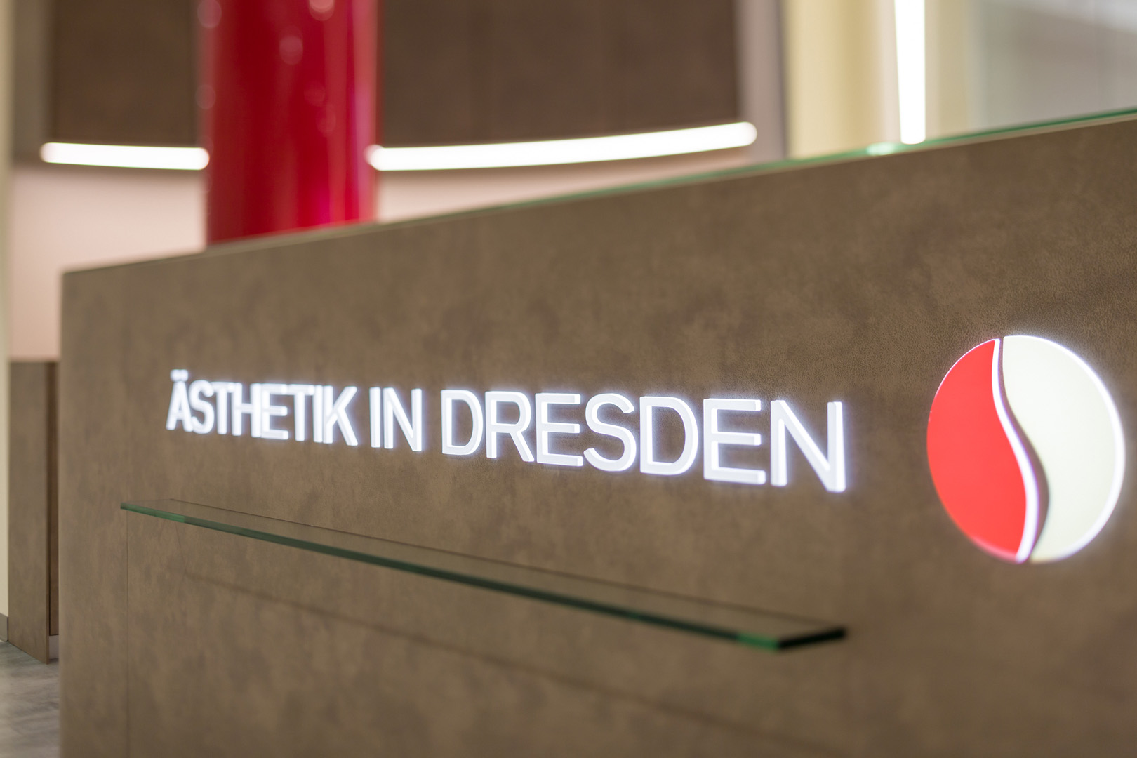 - Tresen mit eingelassener Glastaschenablage und eingelassenem beleuchtetem Firmenlogo