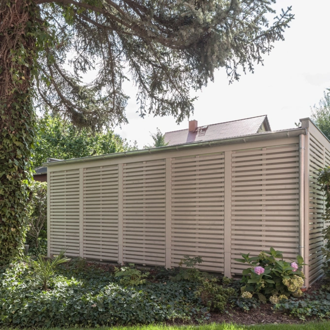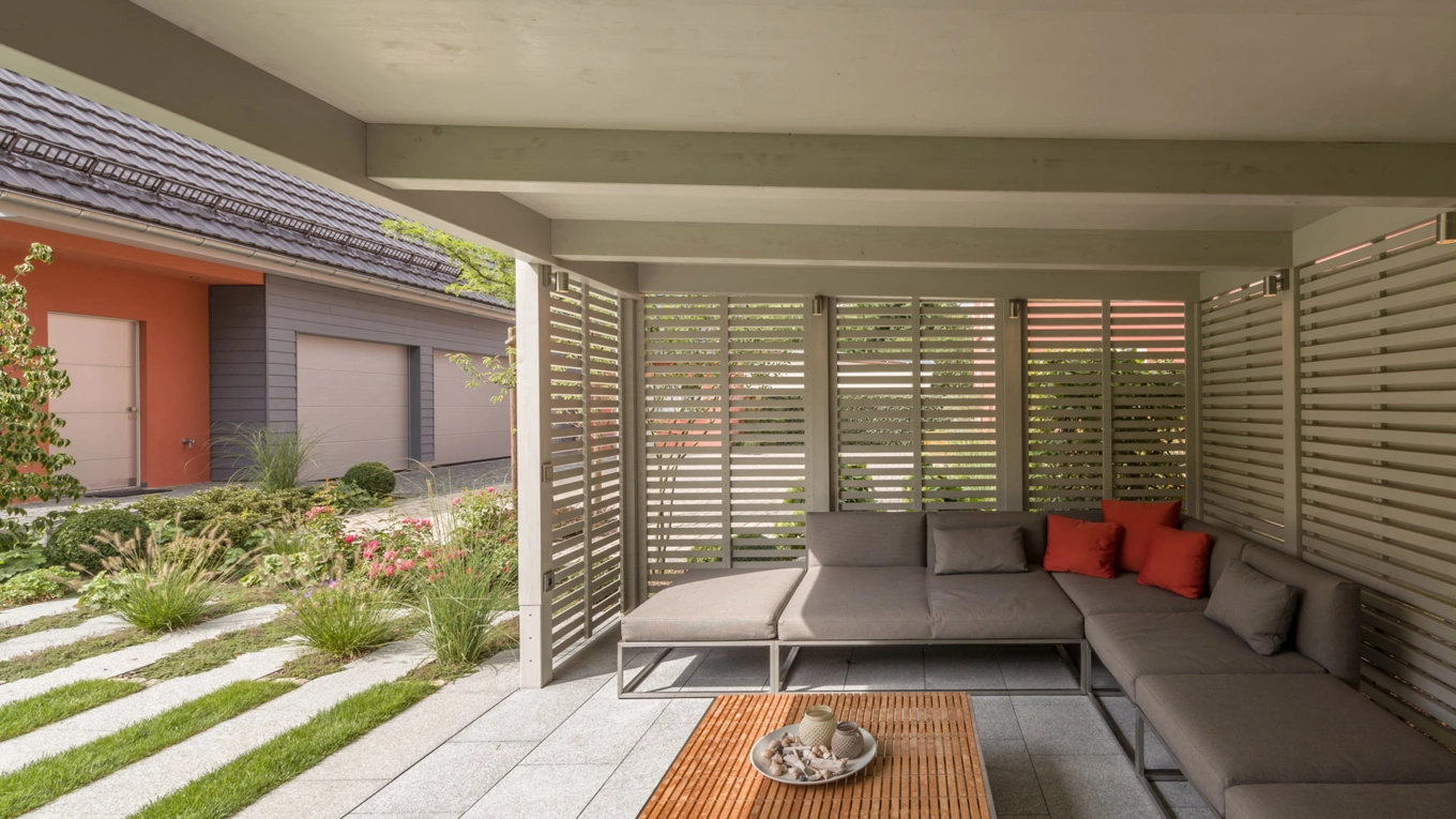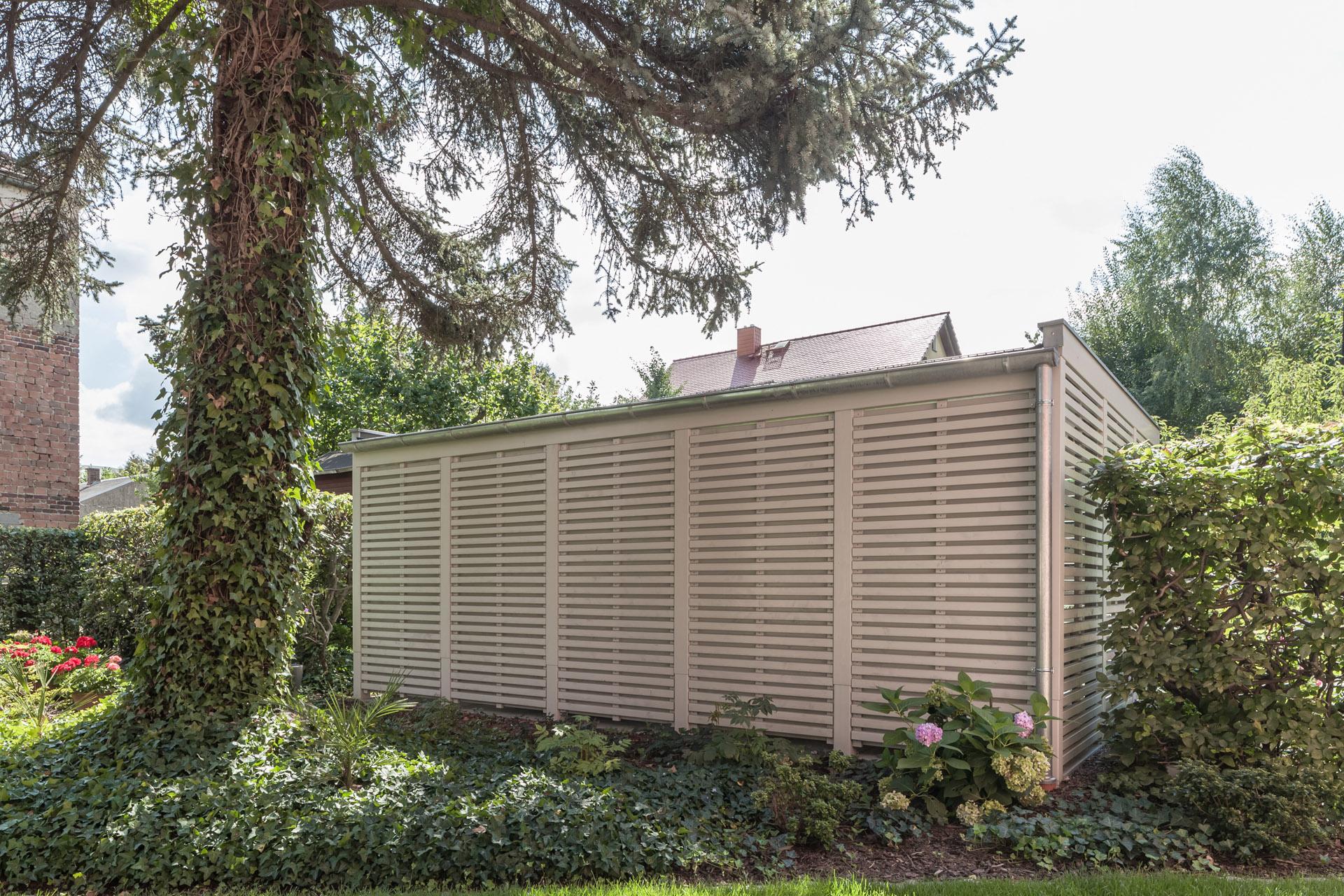 - Rankgitter seitlich und auf der Dachfläche, Begrünung des Daches als Sicht- und Wärmeschutz