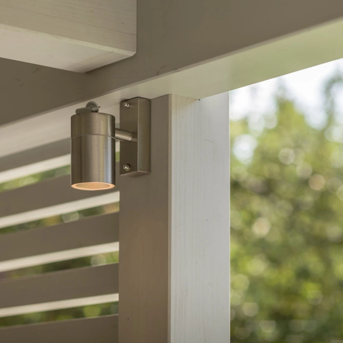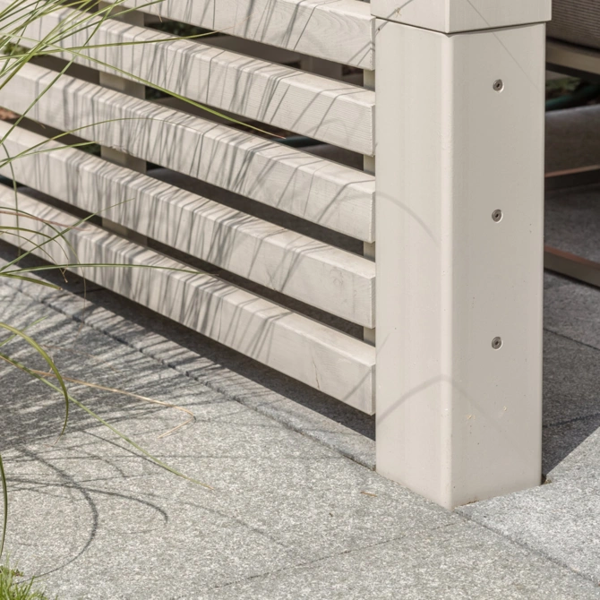 - Massive Metallstützenfüße, filigran ausgearbeitet, um einen homogenen optischen aber vor allem einen konstruktiven Holzschutz zu gewährleisten