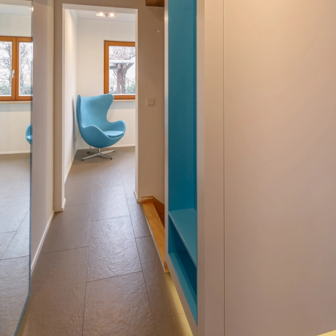 - EG-Schrankelement als Stauraum, seitlich integrierte Garderobe (türkiesblau hinterlegt)