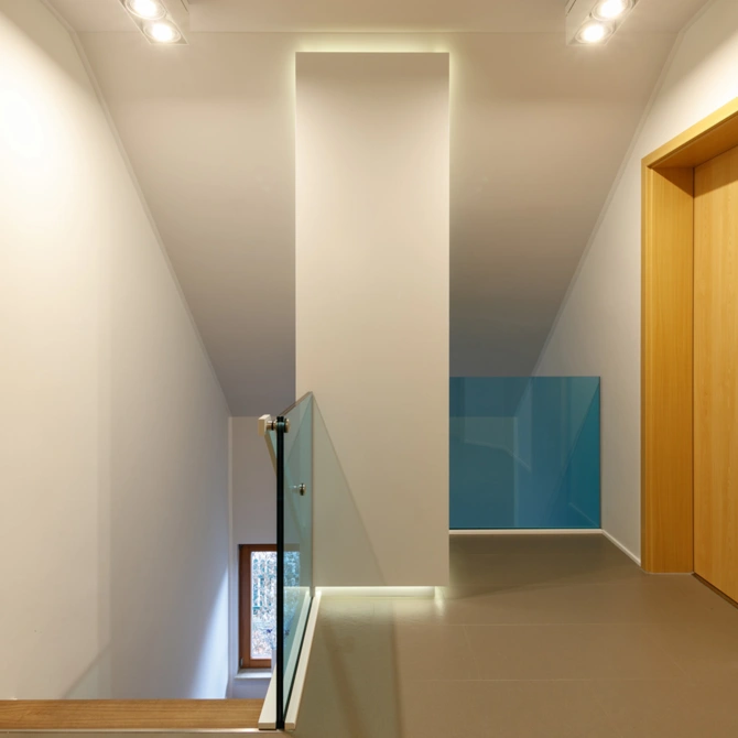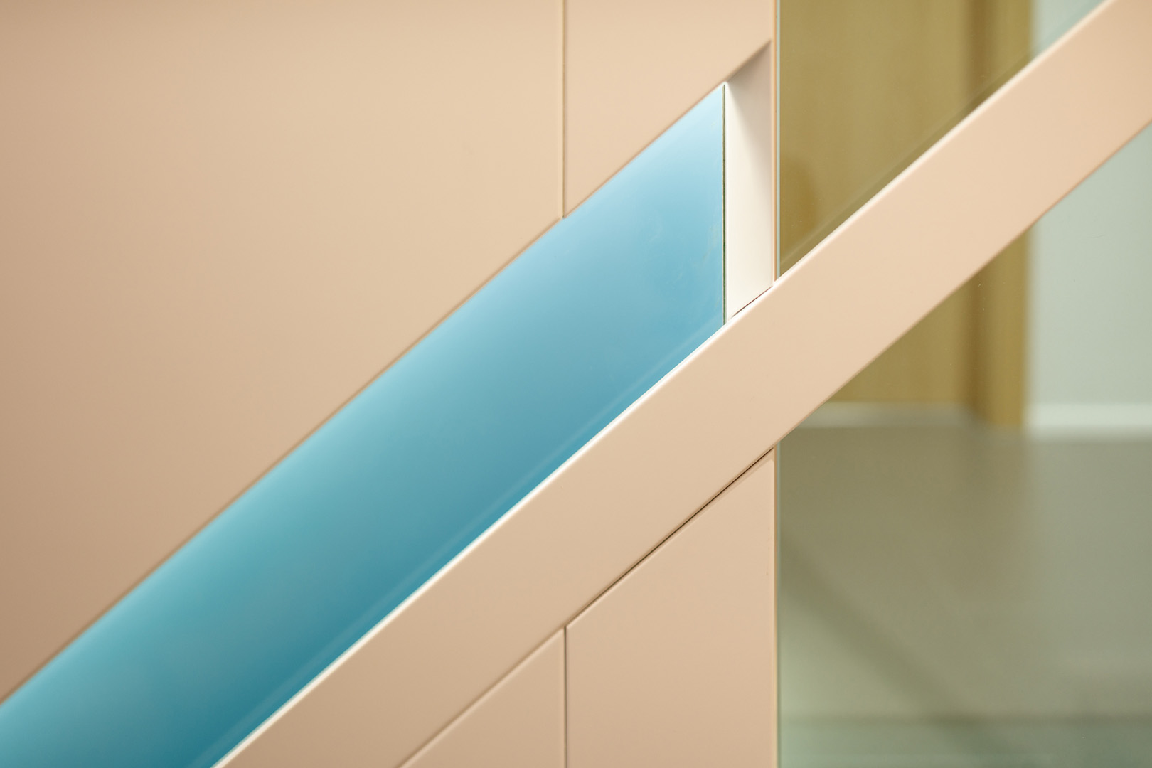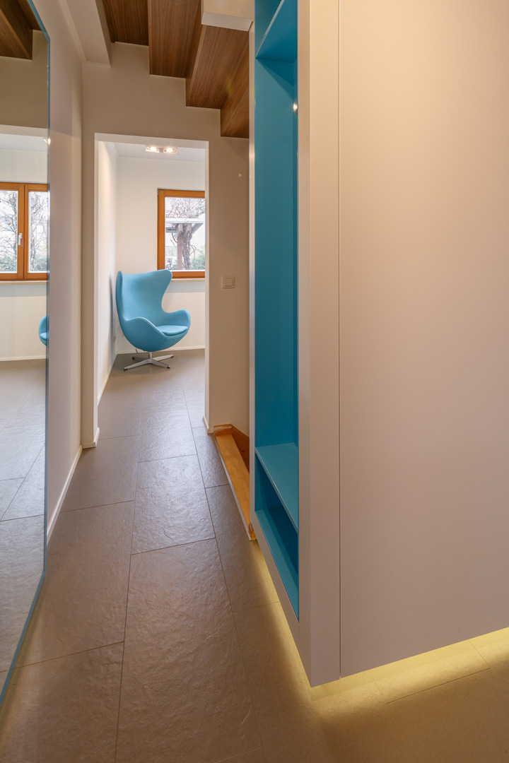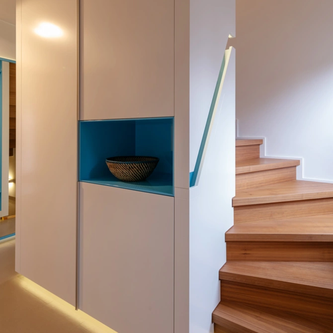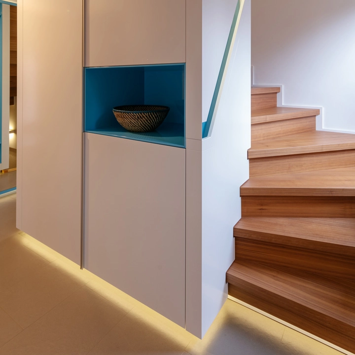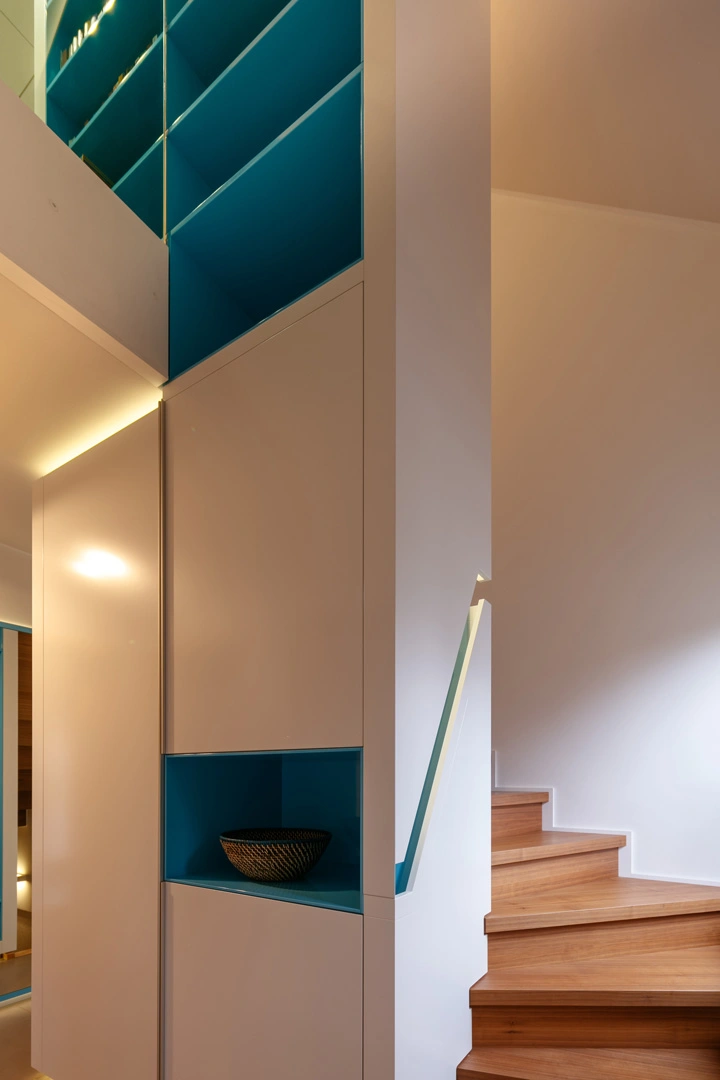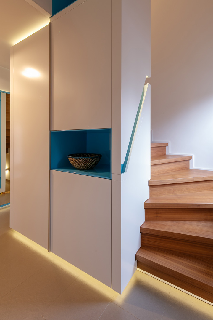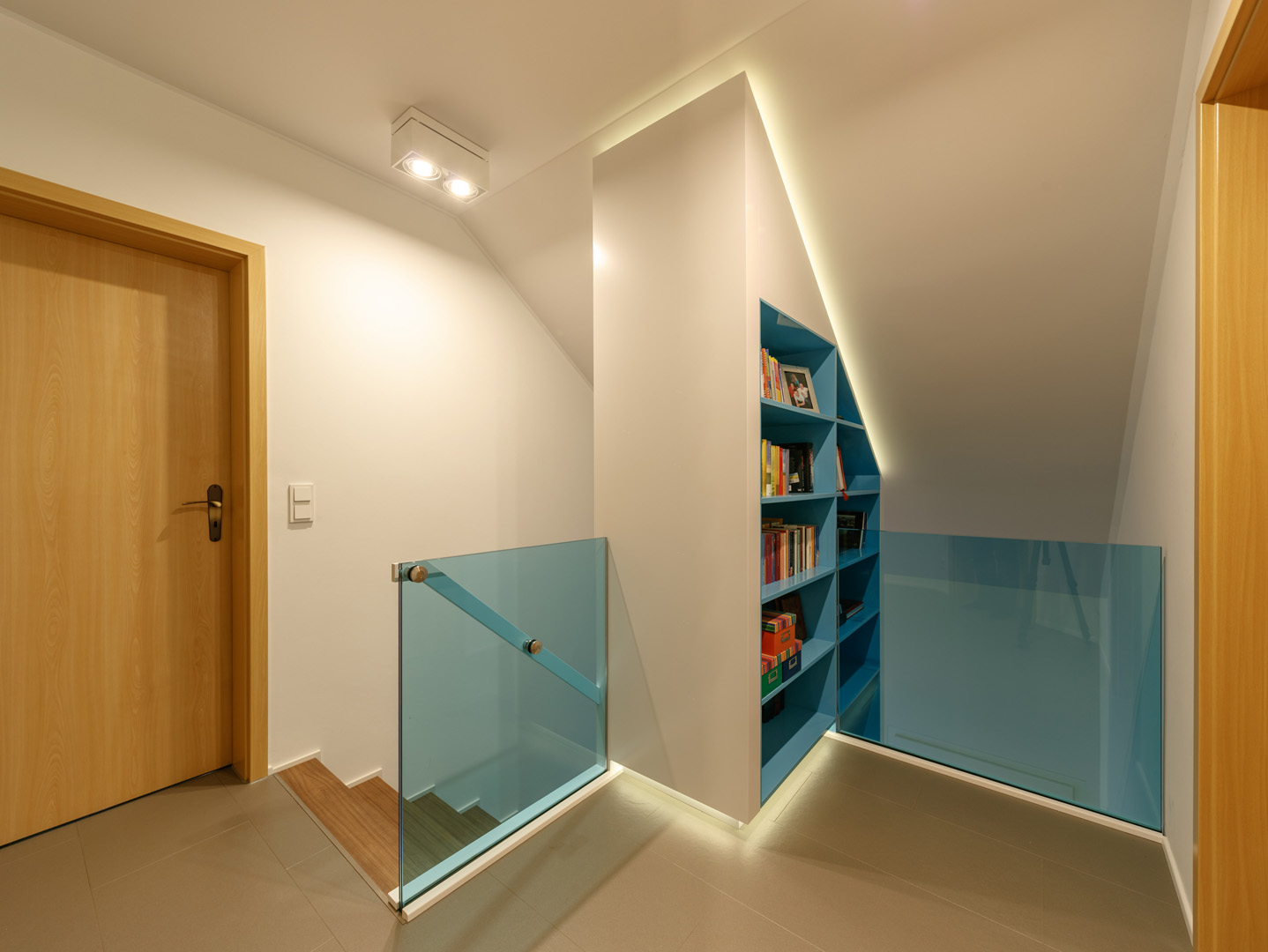- OG- Schrankübergang zum Bücherregal (türkiesblau hinterlegt, Ummantelung mit beleuchtetem, integriertem Handlauf