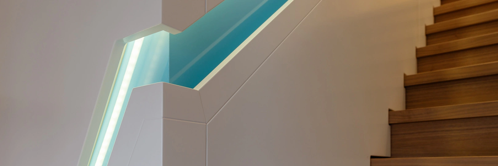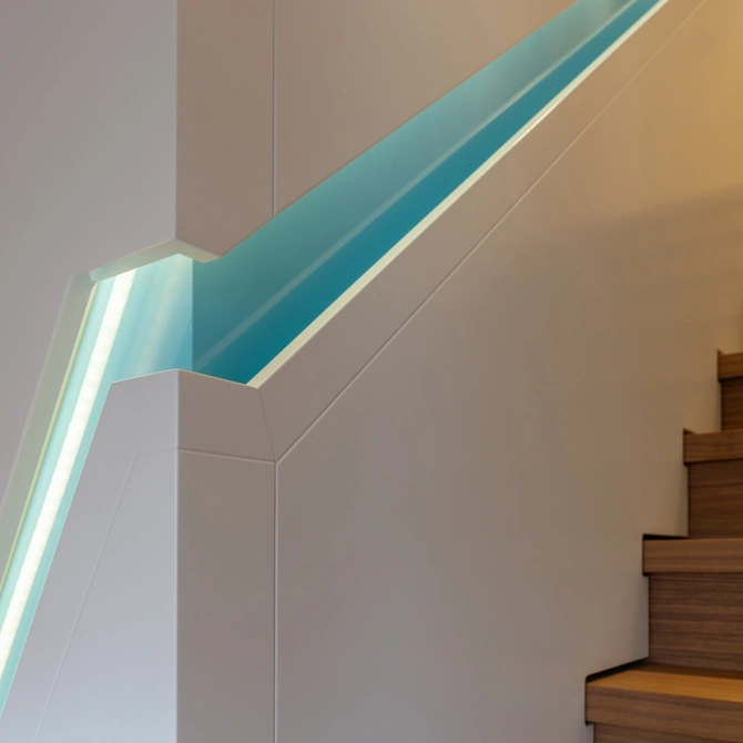 - Sockel, Handlauf und Deckenkranz sind indirekt unterleuchtet
