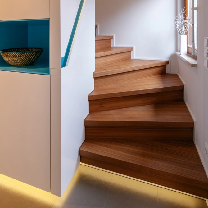 - Treppe bestehend aus Treppen und- Setzstufen aus Multiplex mit Nussbaum-Starkfurnier belegt und klar lackiert
