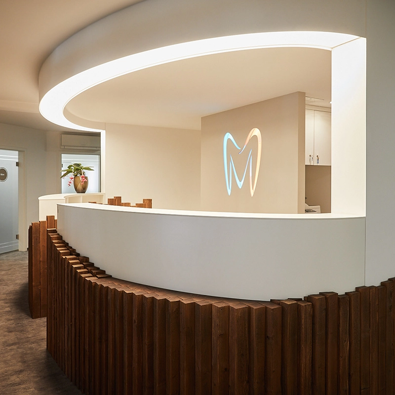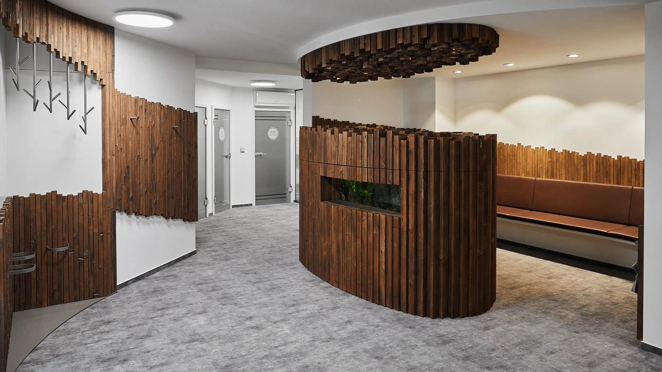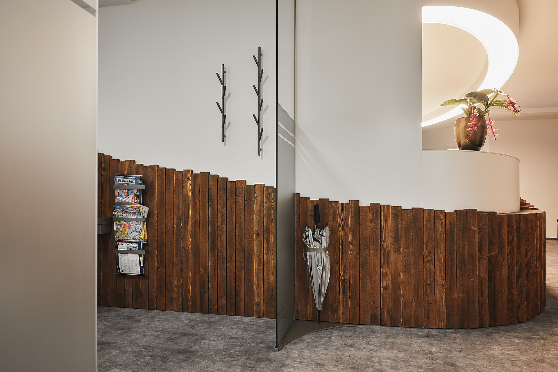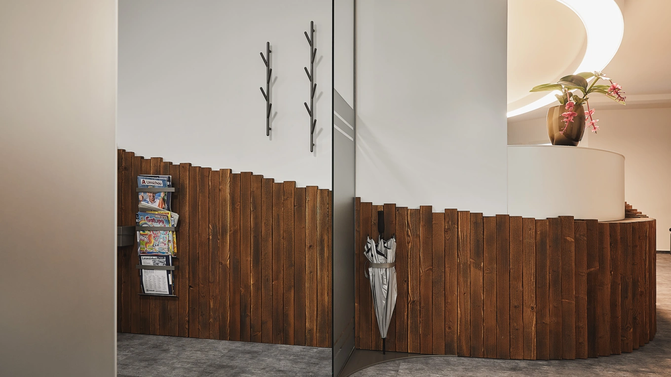 Hier kann man dem Zahnarzttermin entspannt entgegensehen: Zwischen Amazonasaquarium und Altholzpalisaden. Das Design zieht sich in sanften Wellen über zwei Etagen vom Tresen über Wartebereiche bis zur Kinderspielecke.